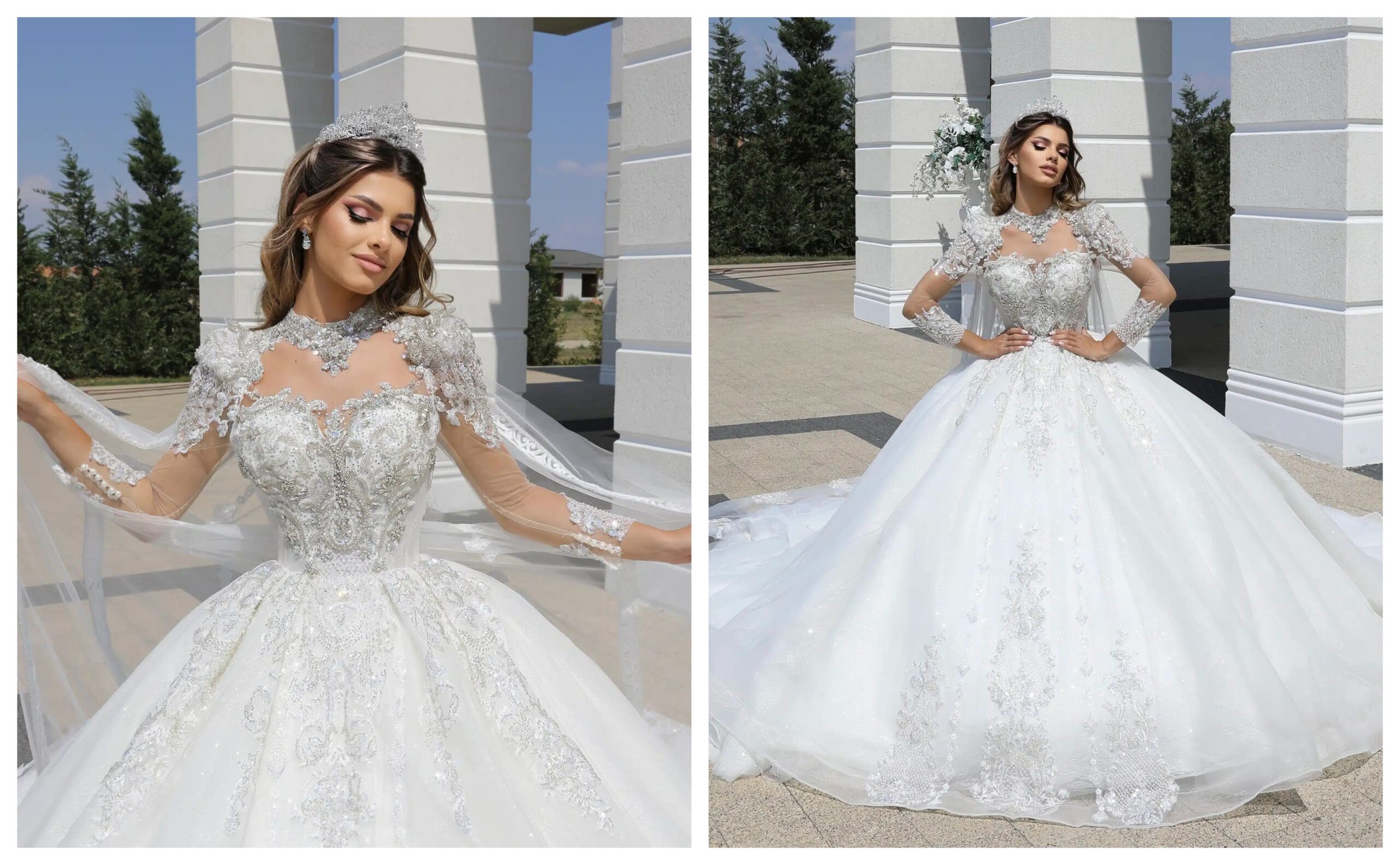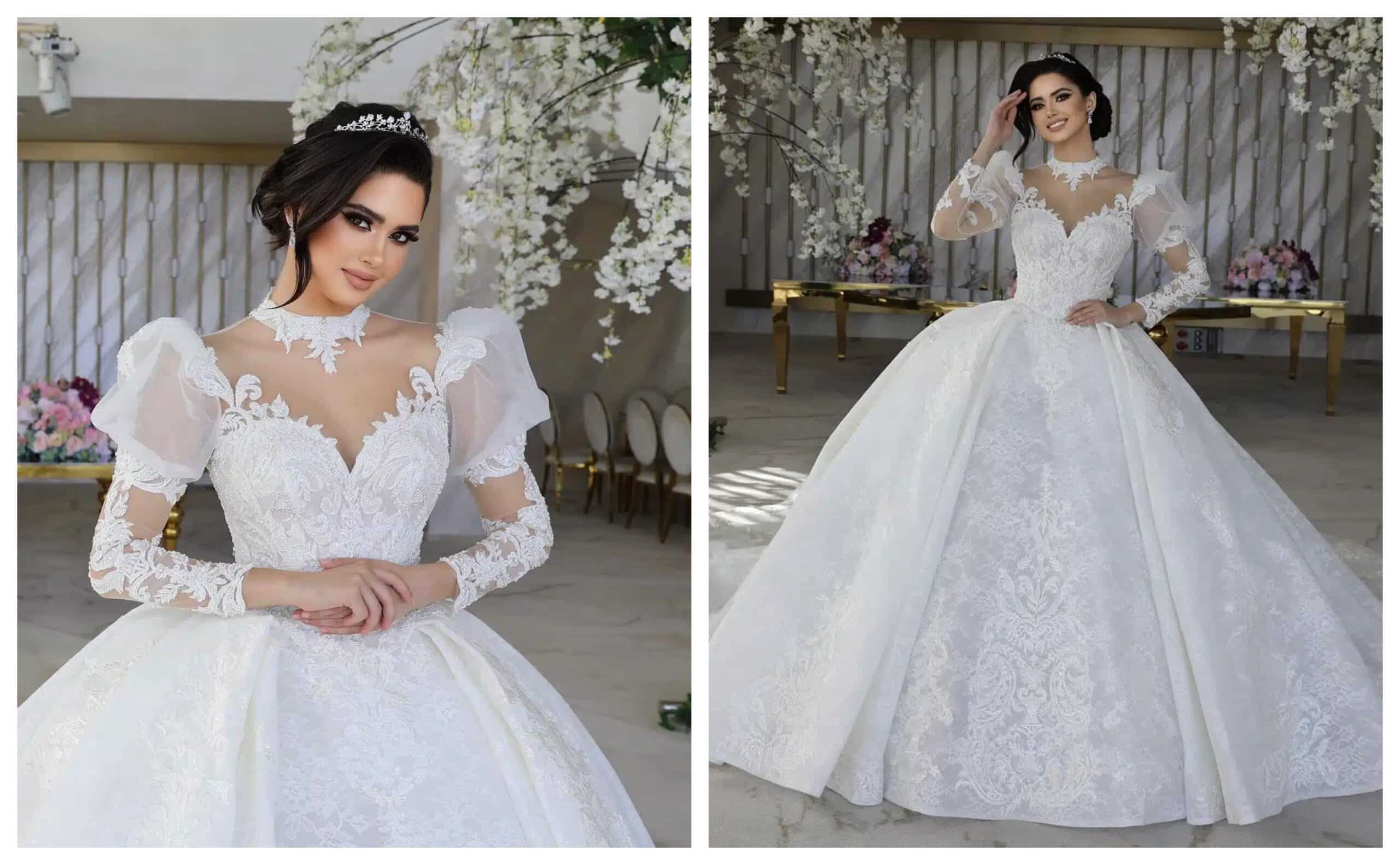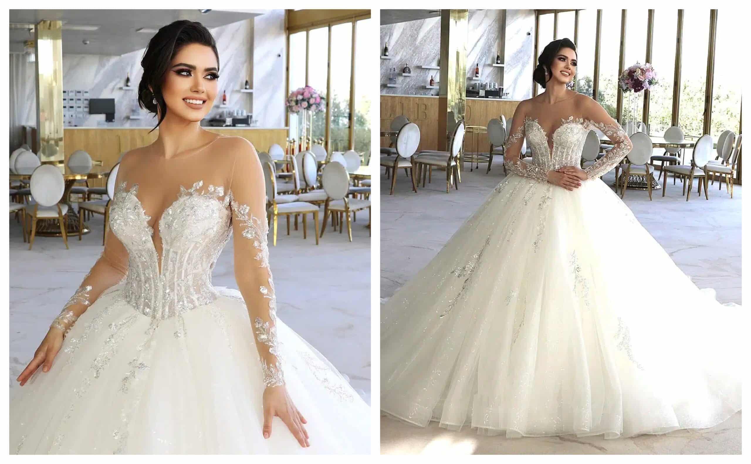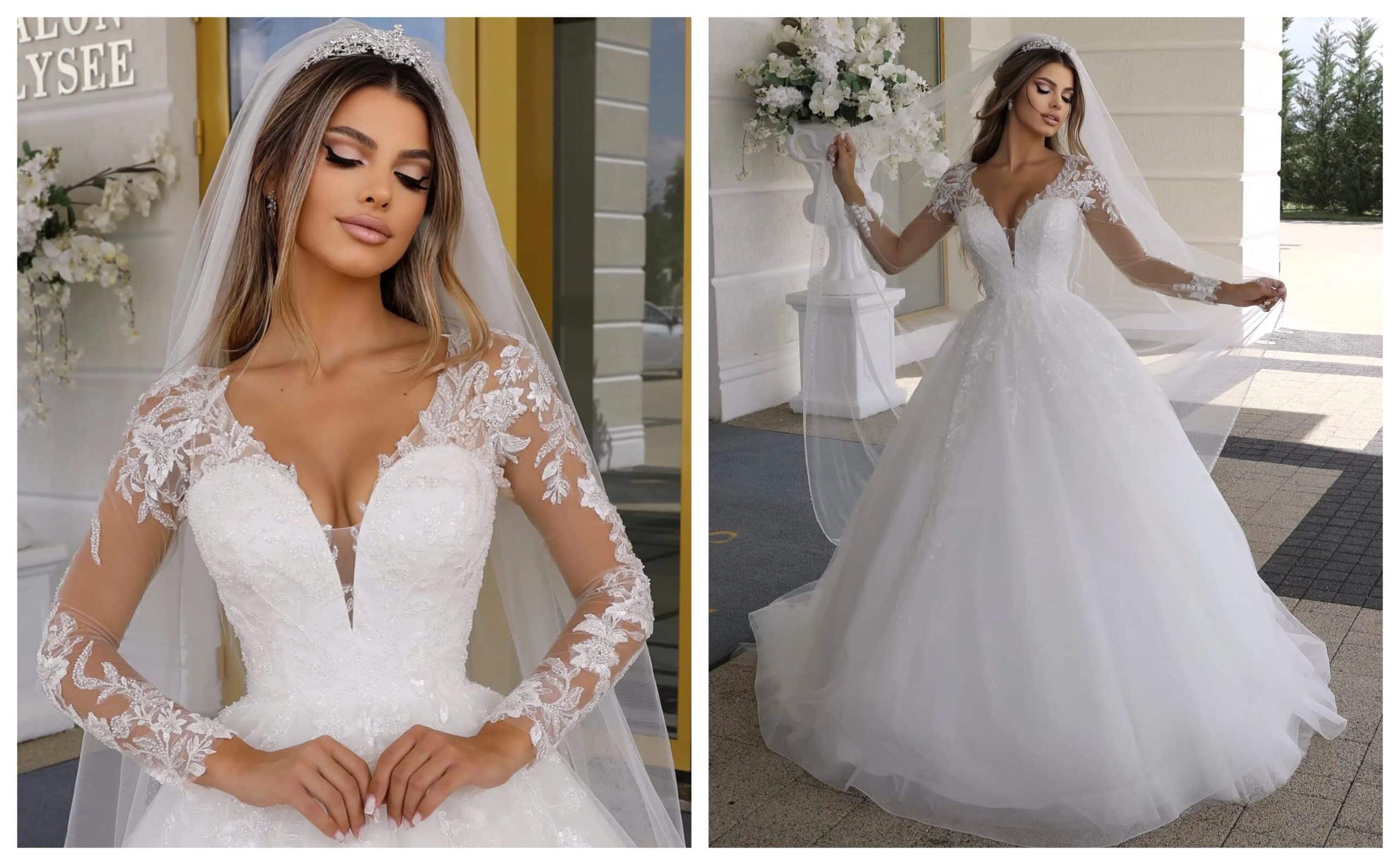 Pentru miresele care visează la un look clasic și romantic, o rochie de mireasă cu mâneci lungi brodate cu dantelă este alegerea perfectă. Un model deosebit este această rochie cu mâneci din tulle transparent, decorate cu aplicații de dantelă, care creează un efect vizual de subțiere a brațelor. Această variantă oferă acoperire fără a fi prea încărcată, fiind potrivită pentru orice tip de siluetă.