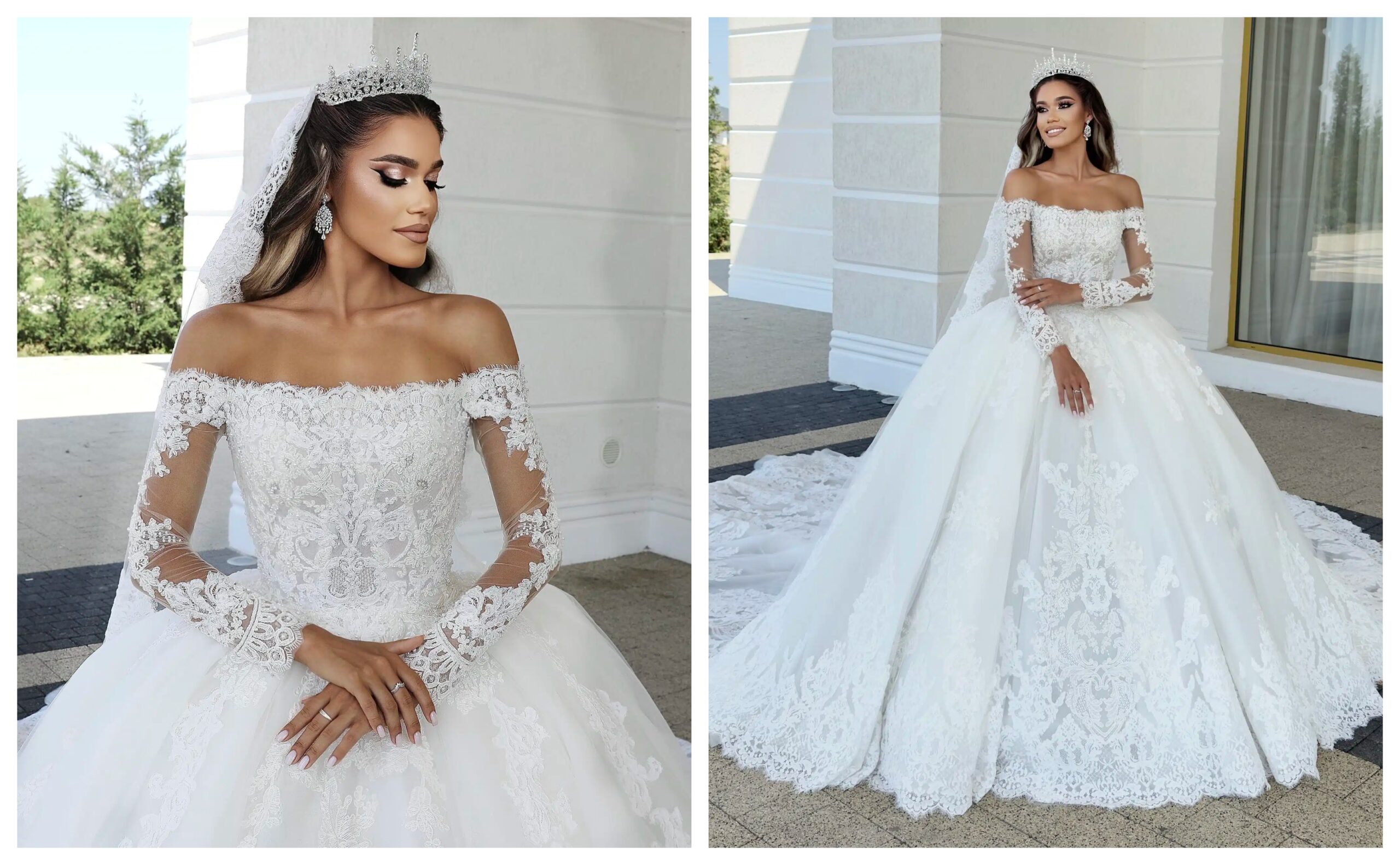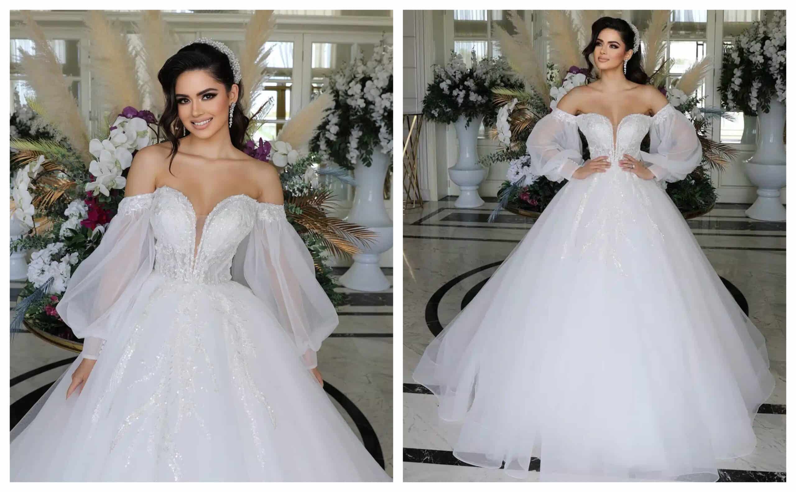 Dacă îți dorești un look sofisticat și feminin, o rochie de mireasă cu mâneci lungi și decolteu tip „off-the-shoulder” este o alegere rafinată. Dantela fină și inserțiile transparente creează un joc elegant de texturi, punând în valoare liniile delicate ale gâtului și umerilor.