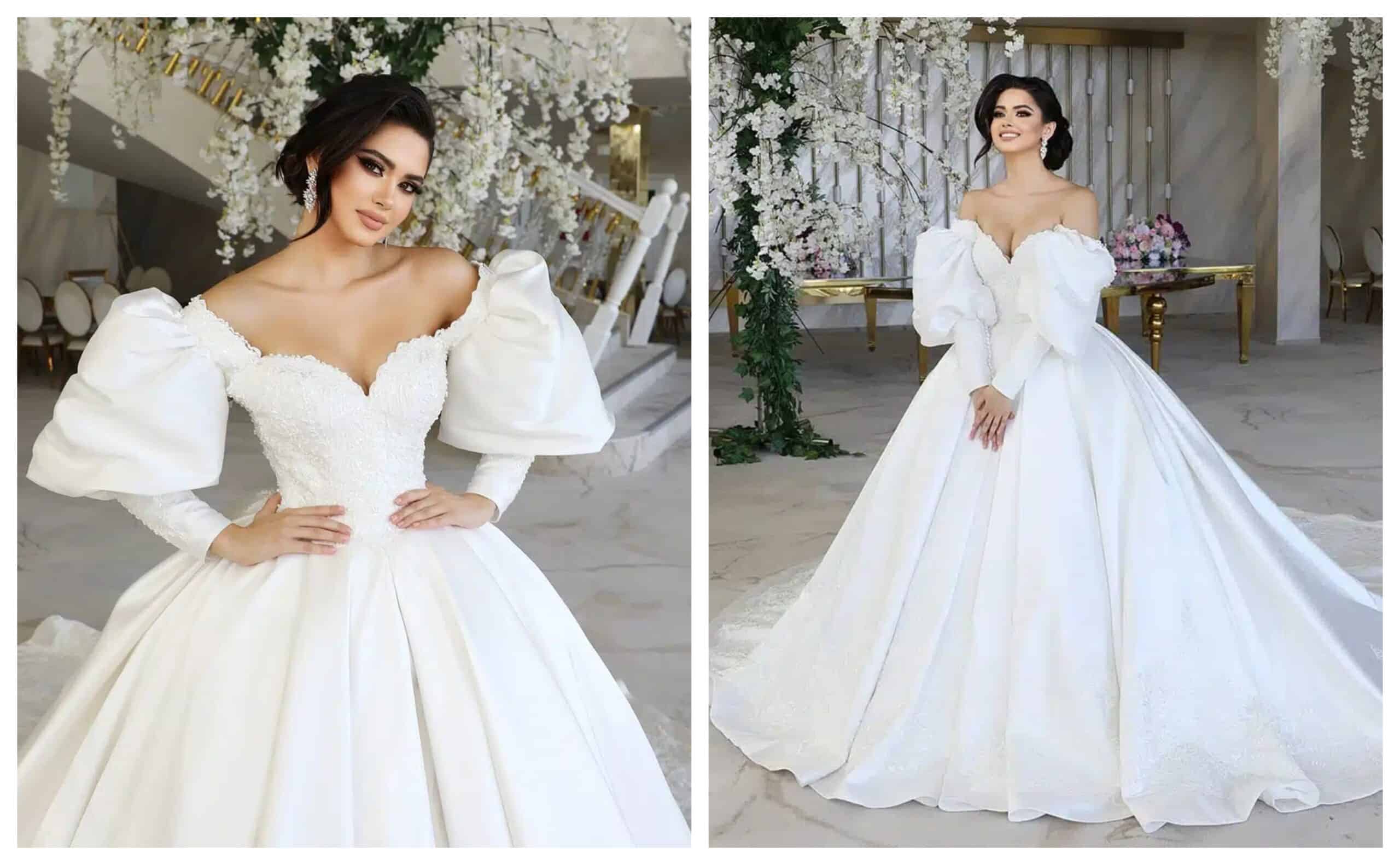 Pentru un look de basm, inspirat din moda regală, rochia de mireasă de tip ballgown cu mâneci bufante este o alegere spectaculoasă. Mânecile bufante cu epoleți corectează aspectul umerilor și adaugă lux și feminitate întregii ținute, în timp ce corsetul bine structurat evidențiază talia și oferă un efect couture.