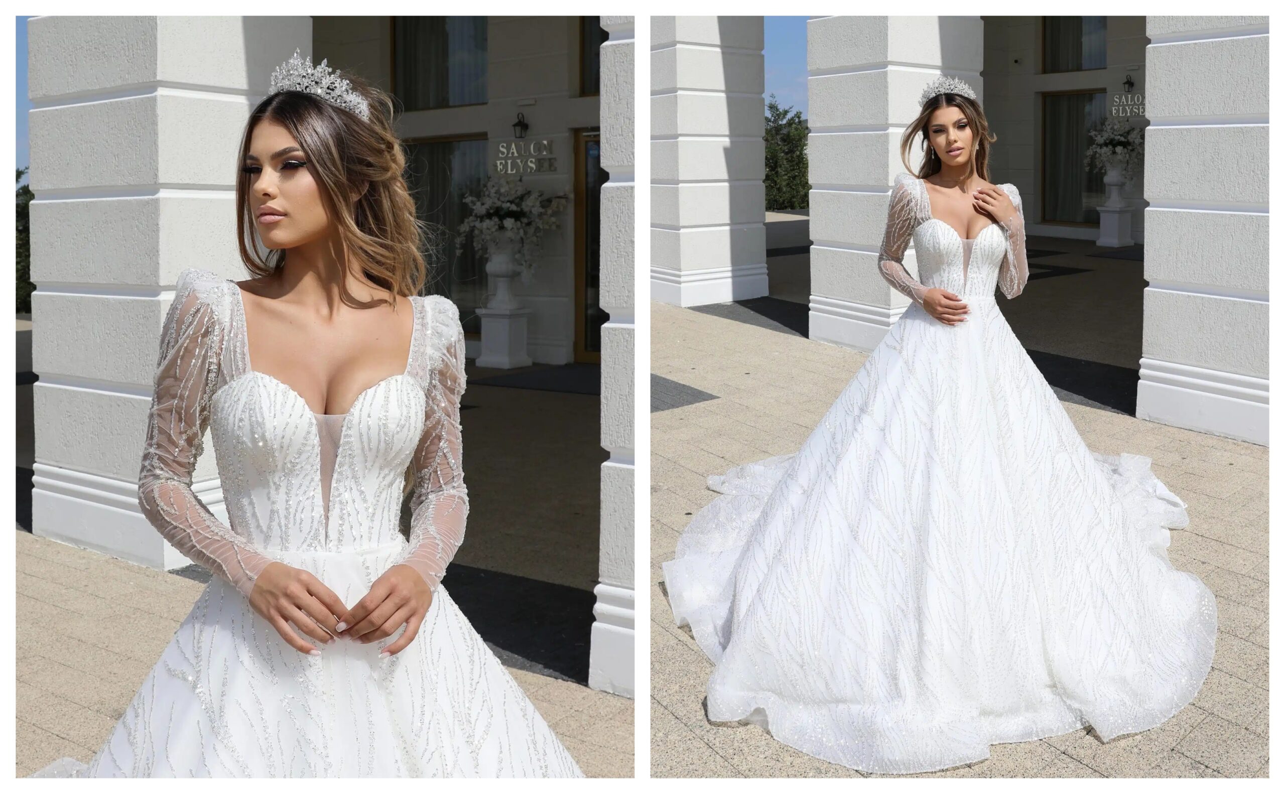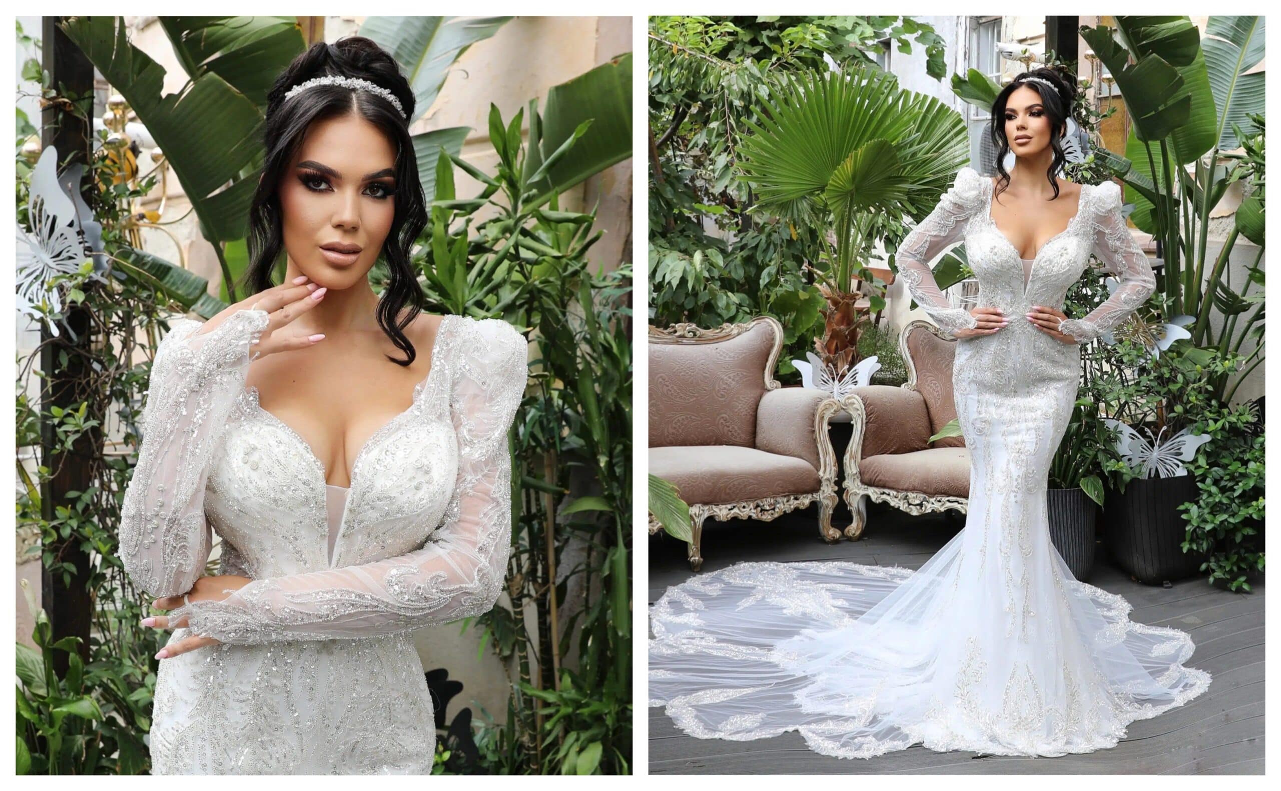 Acest model este ideal pentru miresele care își doresc un echilibru între eleganța tradițională și un aer modern și senzual. Mânecile sunt subțiri și rafinate, cu broderii florale care accentuează delicatețea rochiei.