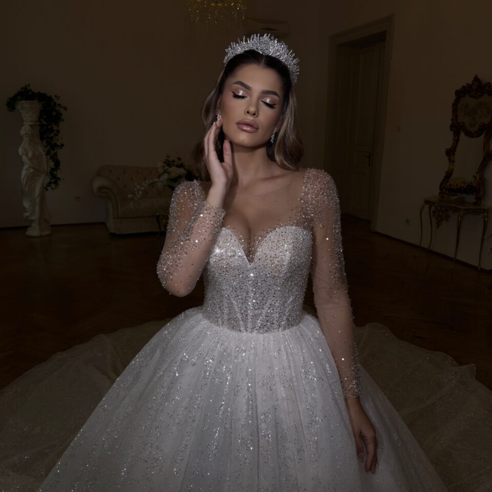 Acest tip de rochii de mireasă prințesă este potrivit pentru nunți de seară sau evenimente unde iluminarea joacă un rol important. Efectul obținut este unul spectaculos, dar echilibrat, care completează perfect volumul specific stilului prințesă și creează o apariție cu adevărat memorabilă.