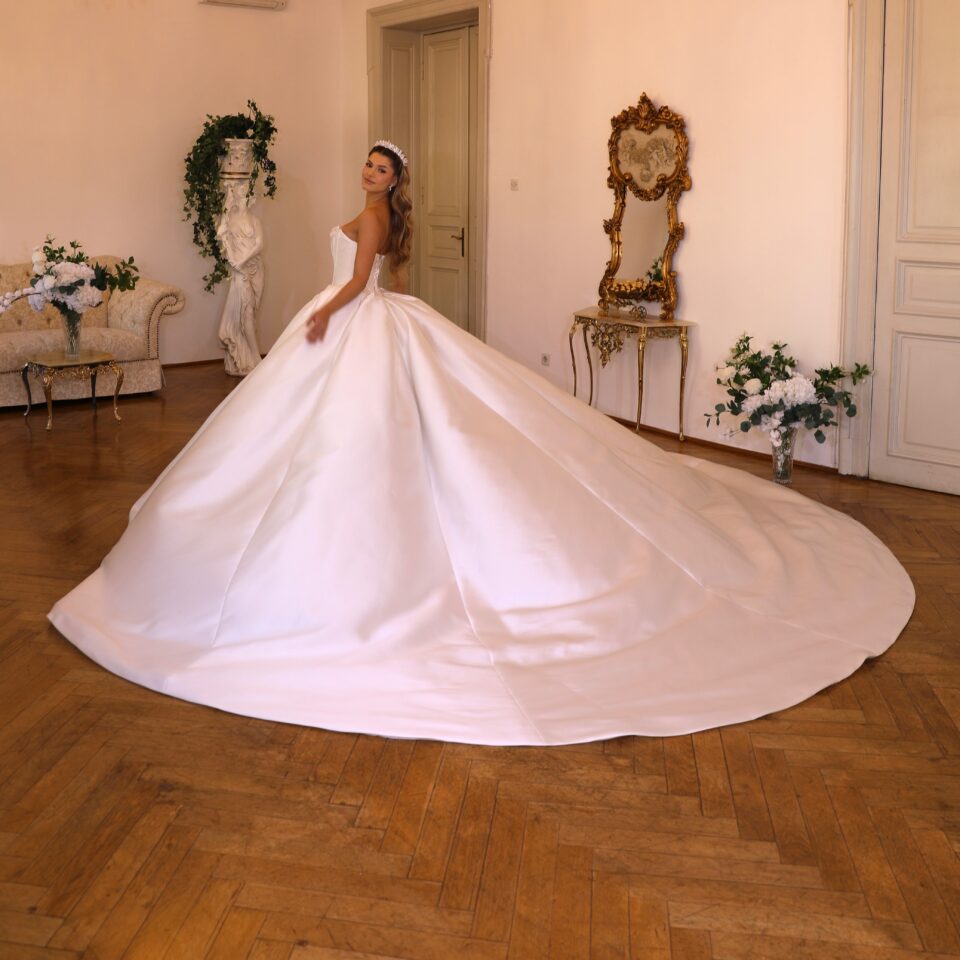 Aceste rochii sunt ideale pentru ceremonii formale și momentele în care intrarea miresei trebuie să fie memorabilă. Trena poate fi mai discretă sau mai amplă, în funcție de stilul rochiei, însă întotdeauna contribuie la acel aer regal specific rochiilor de mireasă prințesă.