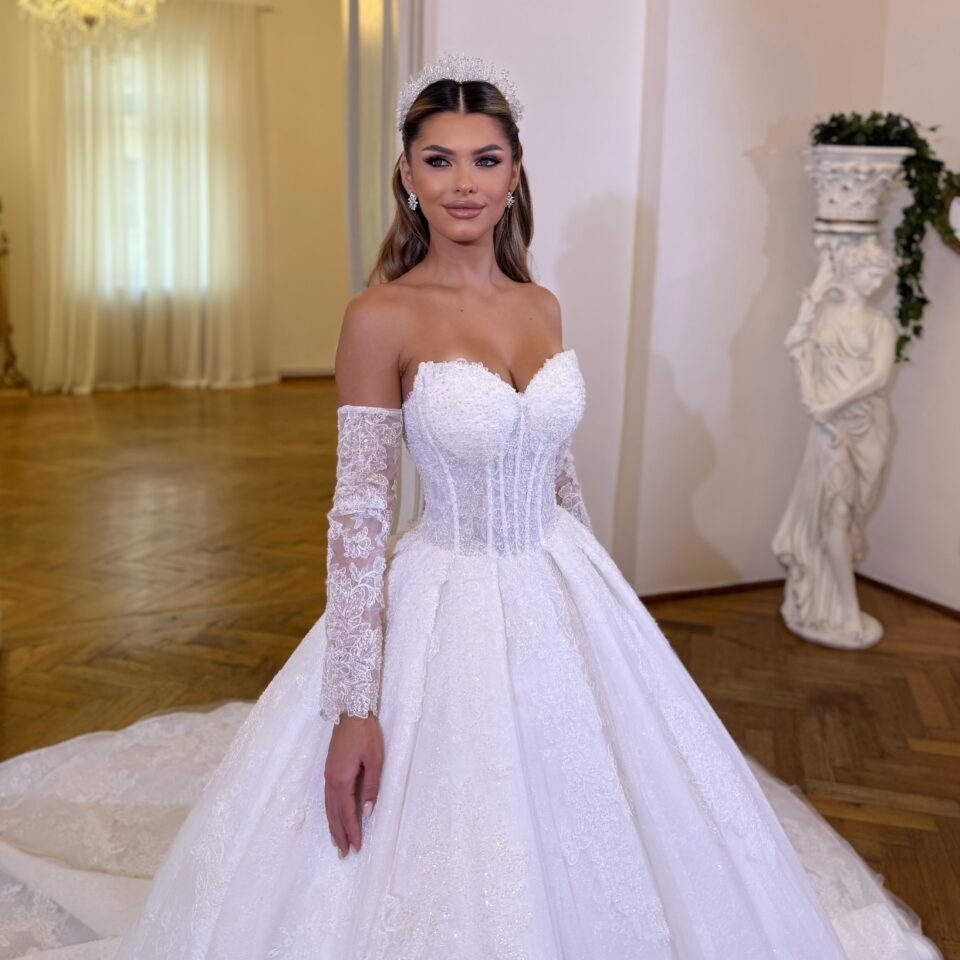 Acest tip de rochii de mireasă prințesă este potrivit pentru nunți elegante, în săli ample, unde luminile pun în evidență fiecare detaliu. Pietrele aplicate discret transformă rochia într-o piesă statement, fără a-i lua din eleganța clasică specifică stilului prințesă.