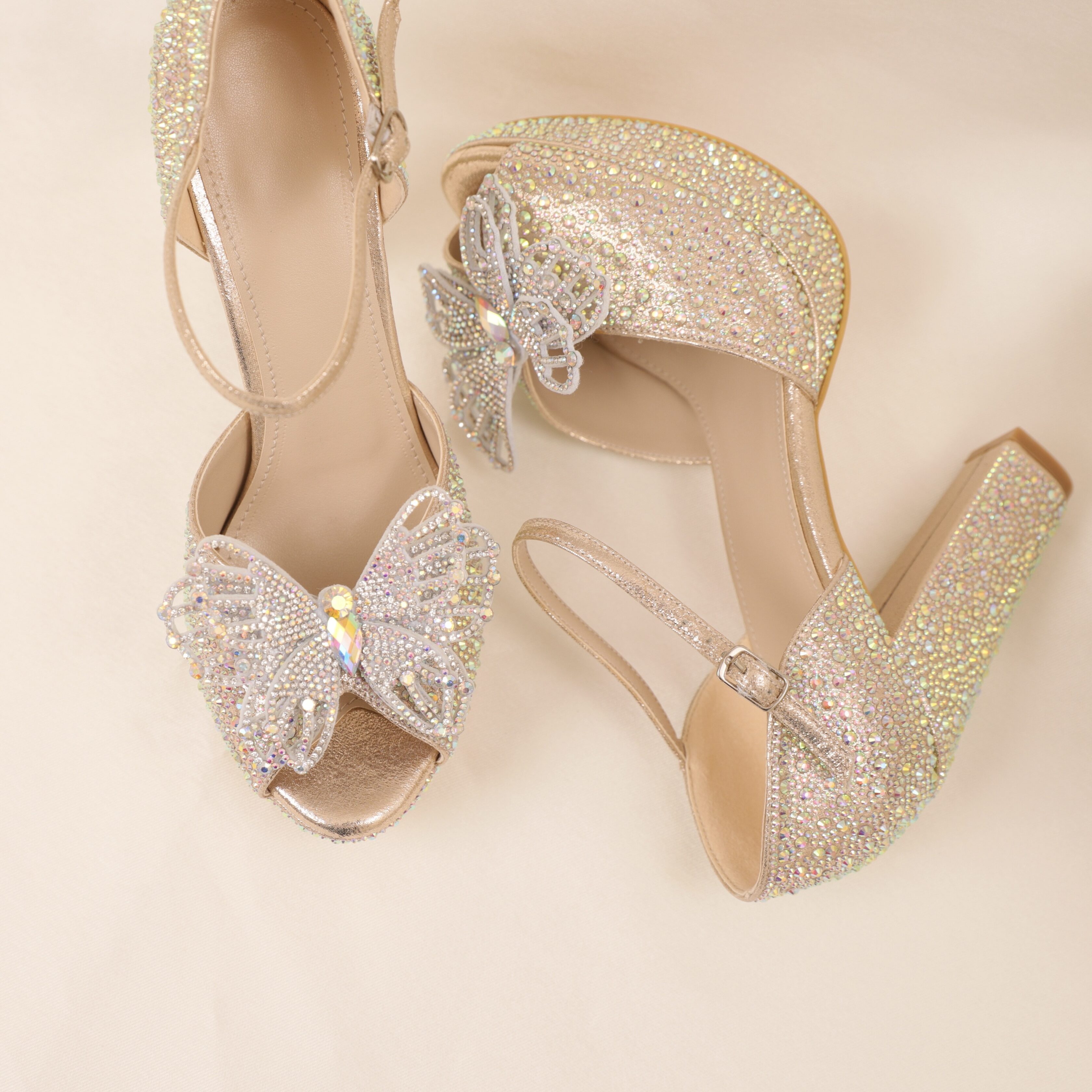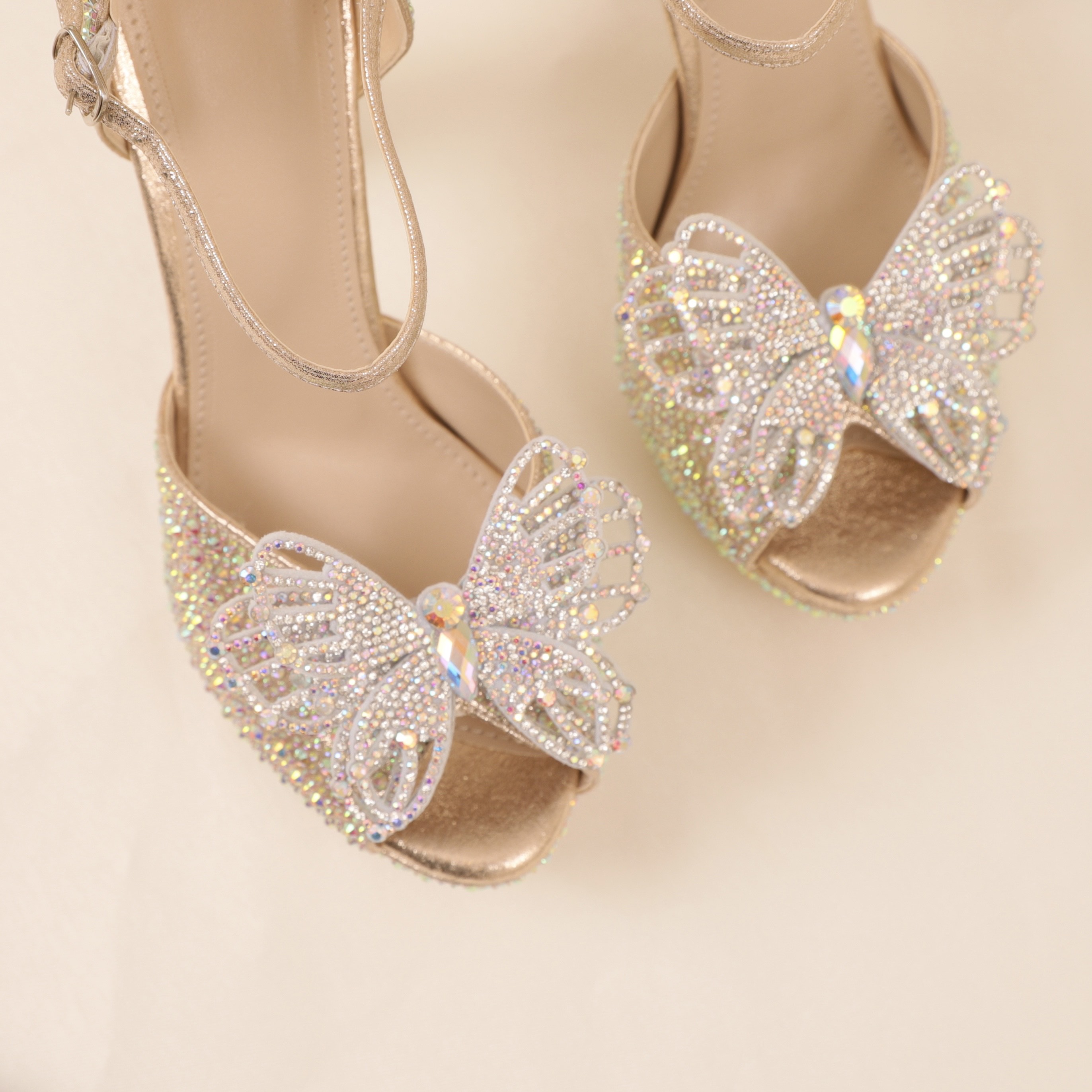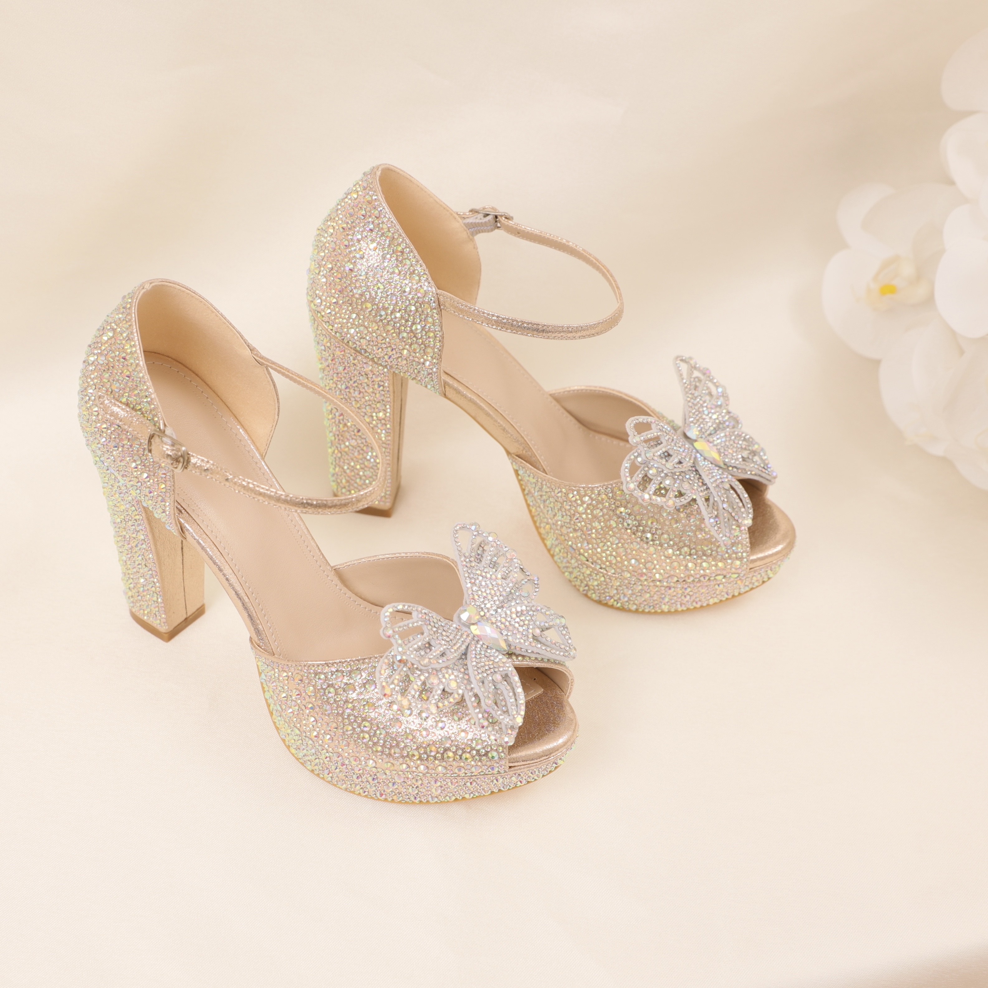 Pantofii Sayonara sunt creați pentru mireasa care iubește detaliile strălucitoare și își dorește o apariție care nu trece neobservată. Realizați din piele vegană într-o nuanță delicată de auriu deschis, aceștia sunt incrustați cu sute de pietricele în nuanțe aurora boreală, ce captează lumina la fiecare pas.