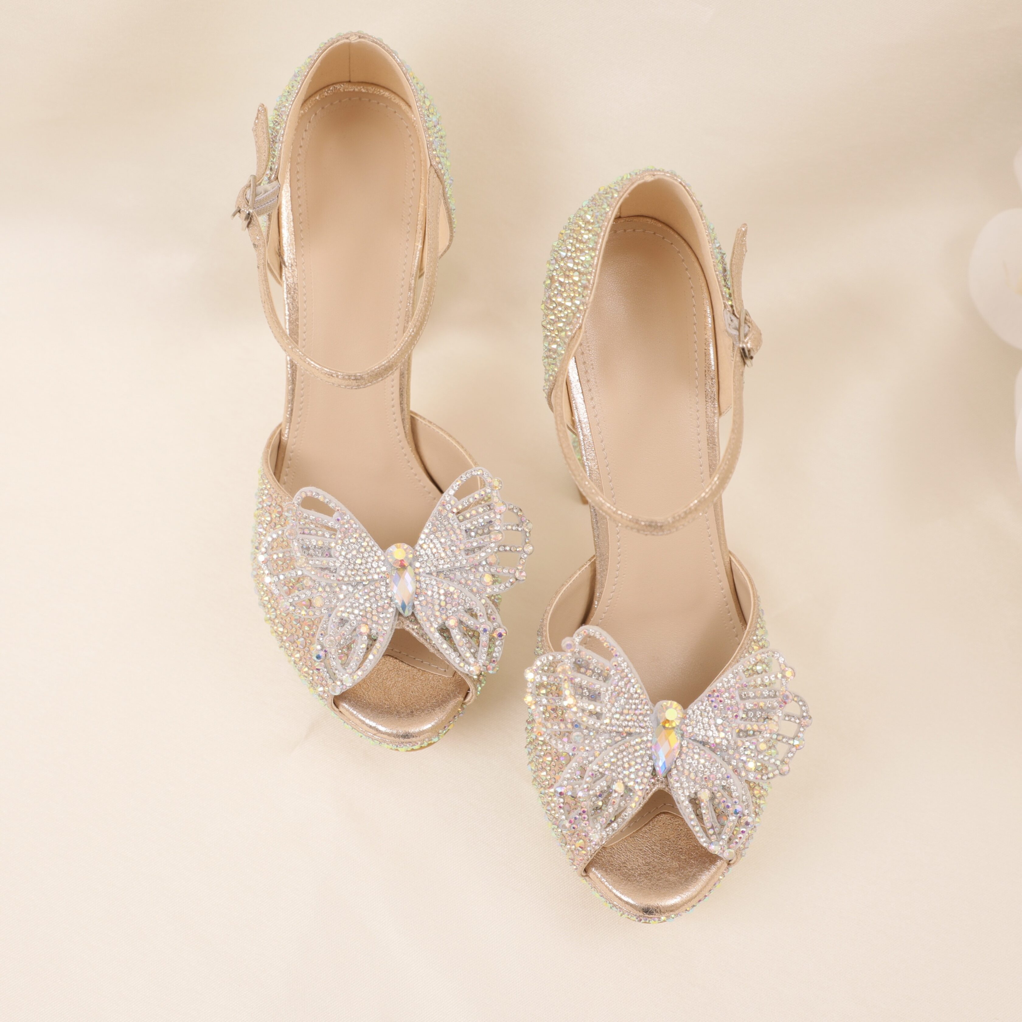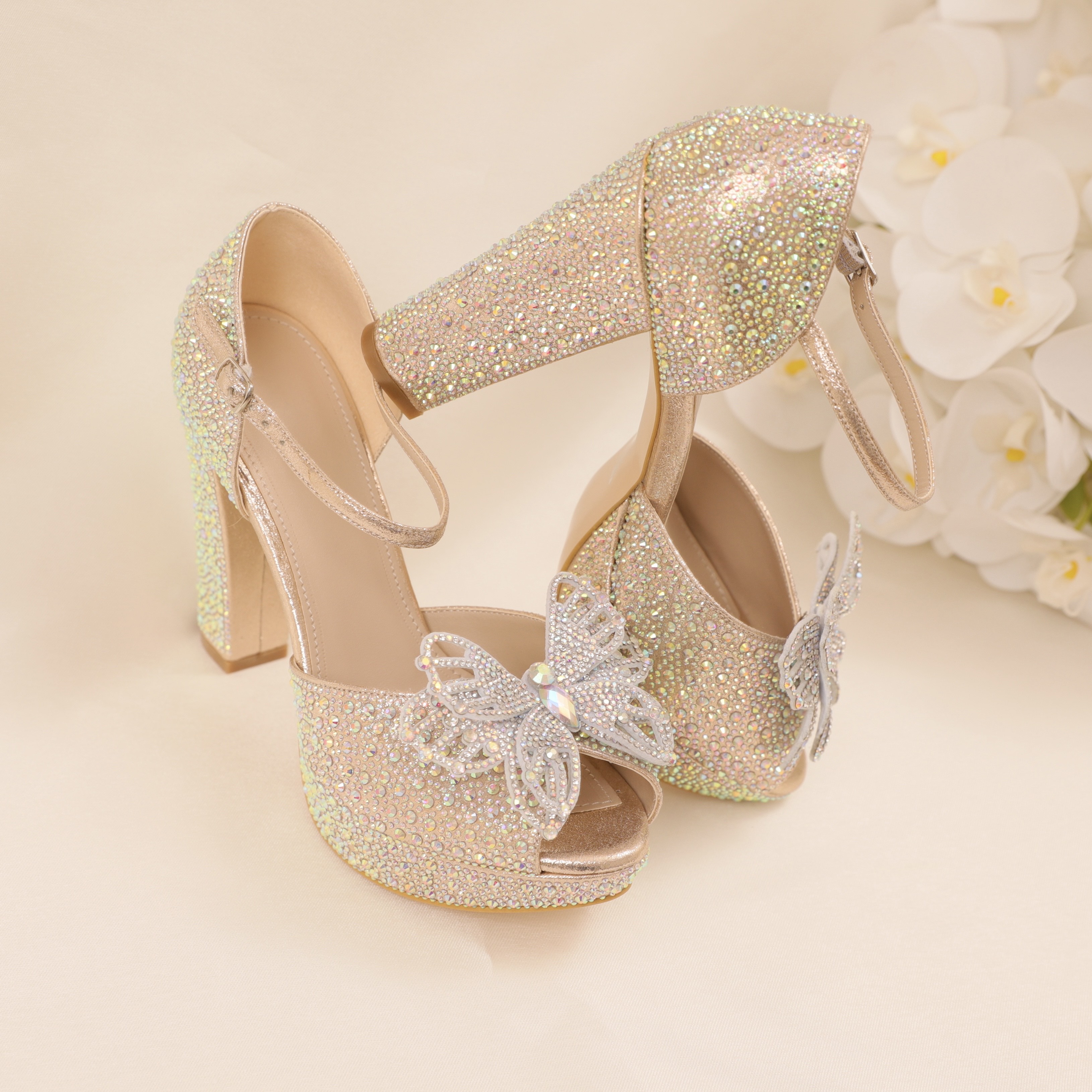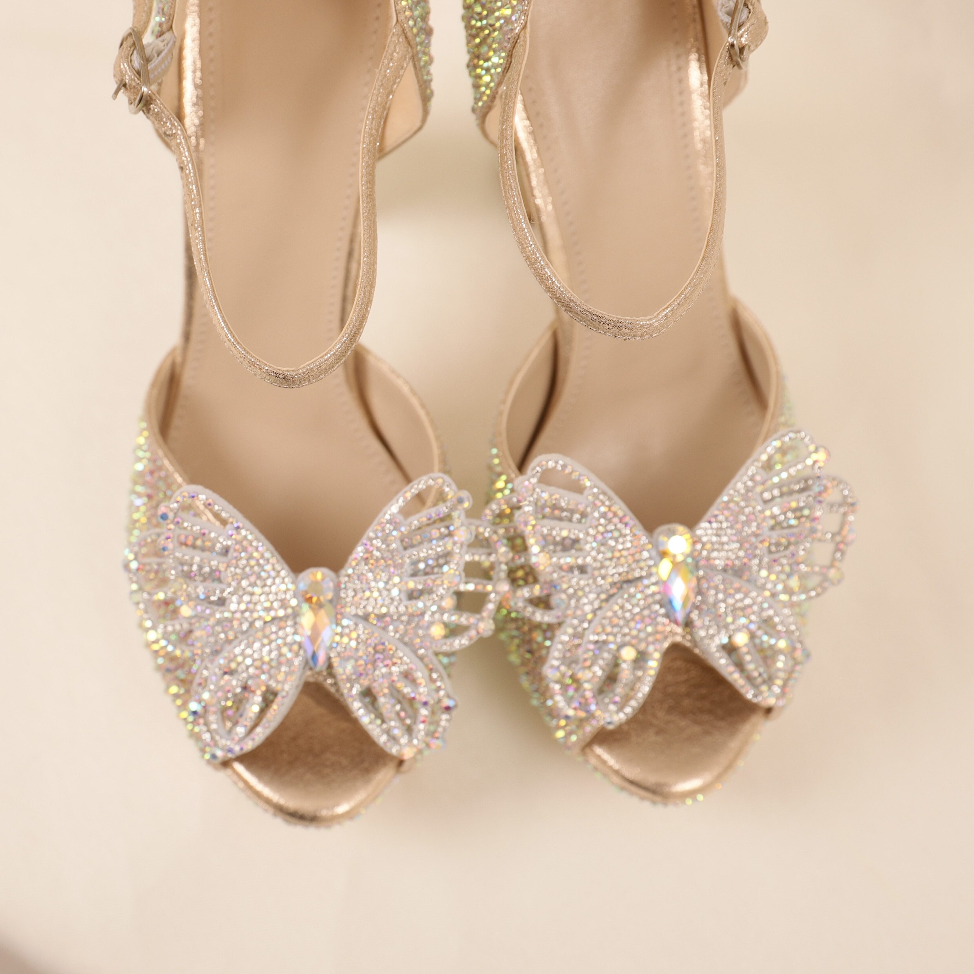 Pantofii Sayonara sunt creați pentru mireasa care iubește detaliile strălucitoare și își dorește o apariție care nu trece neobservată. Realizați din piele vegană într-o nuanță delicată de auriu deschis, aceștia sunt incrustați cu sute de pietricele în nuanțe aurora boreală, ce captează lumina la fiecare pas.