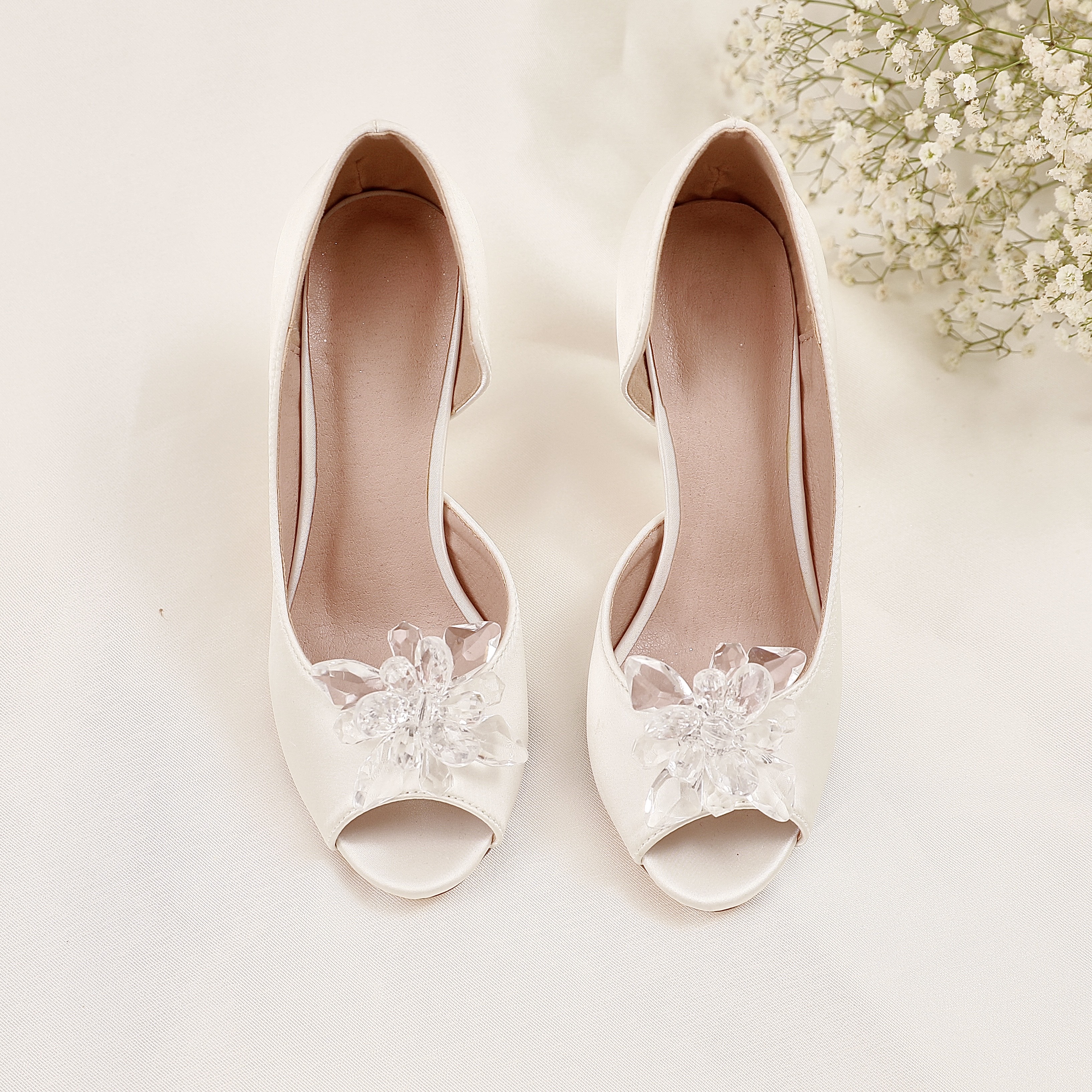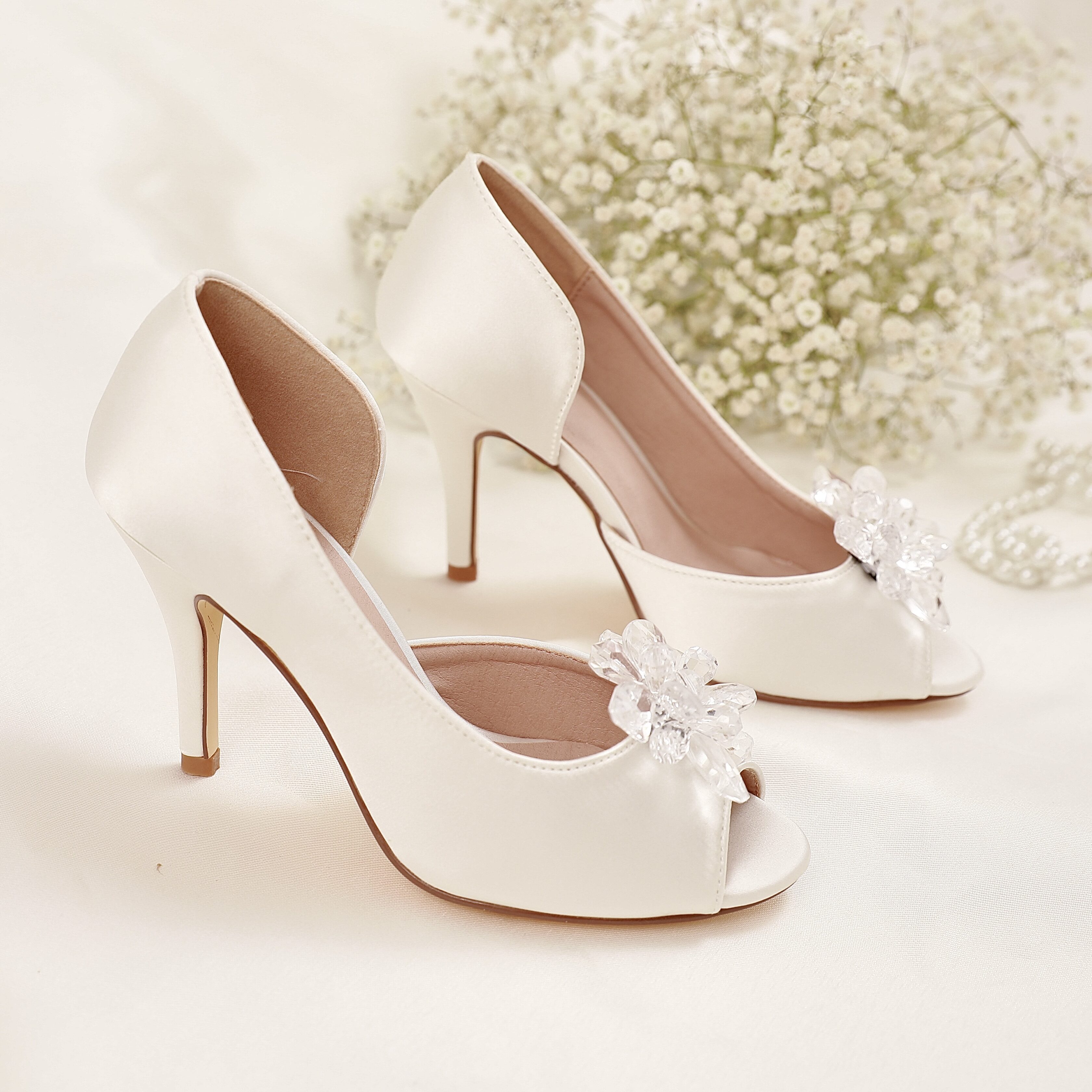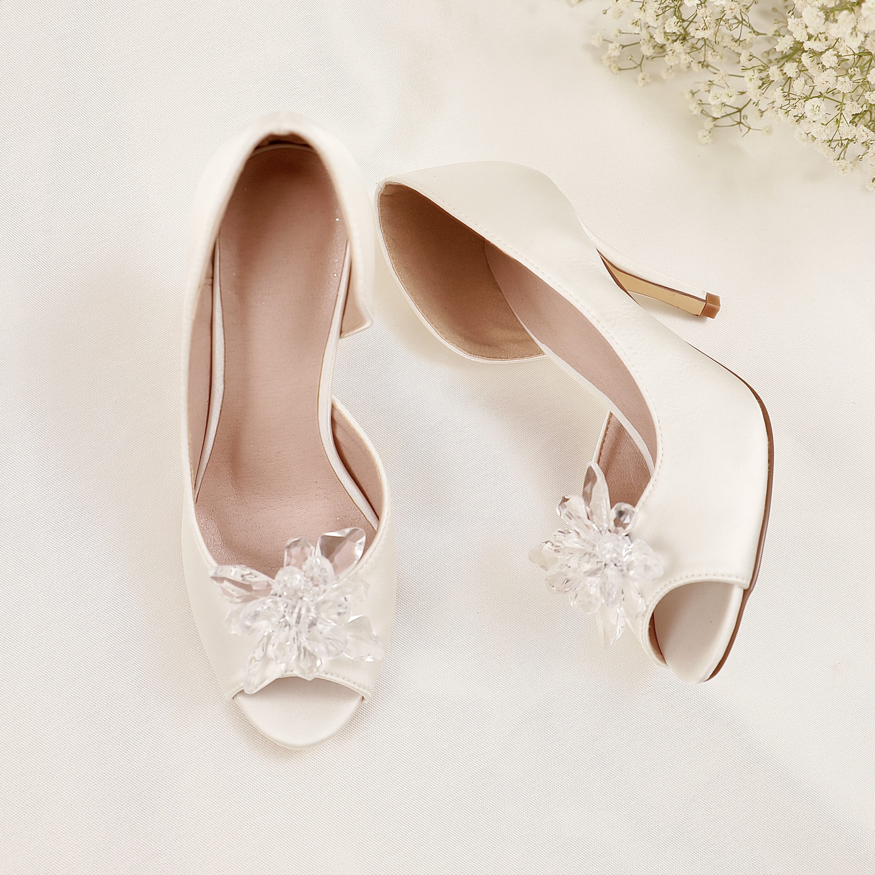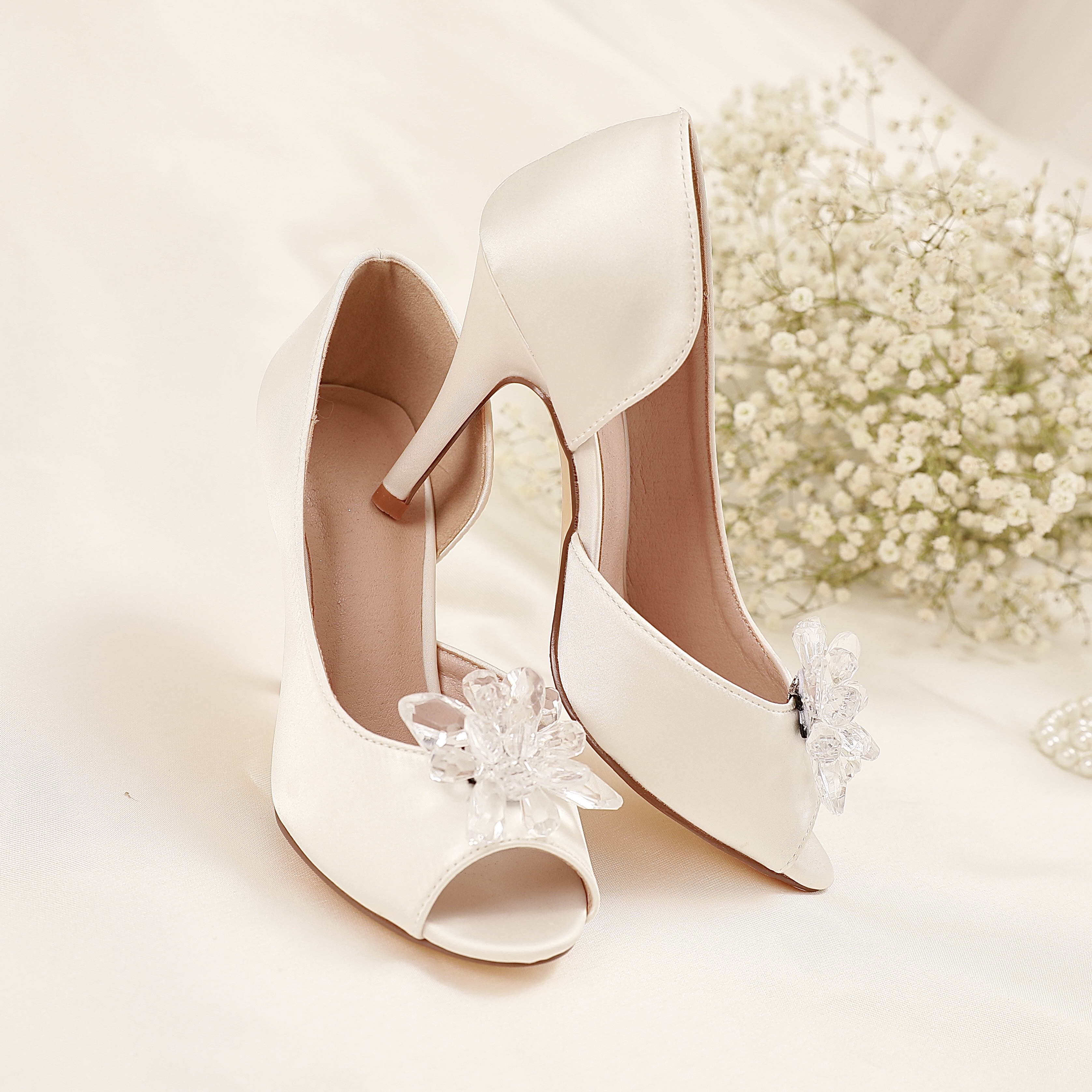 Realizați din piele vegană îmbrăcată în satin de mătase ivory, acești pantofi au un aspect delicat și sofisticat. Modelul decupat pe lateral conturează frumos piciorul, iar vârful deschis în stil peep-toe adaugă un plus de feminitate.