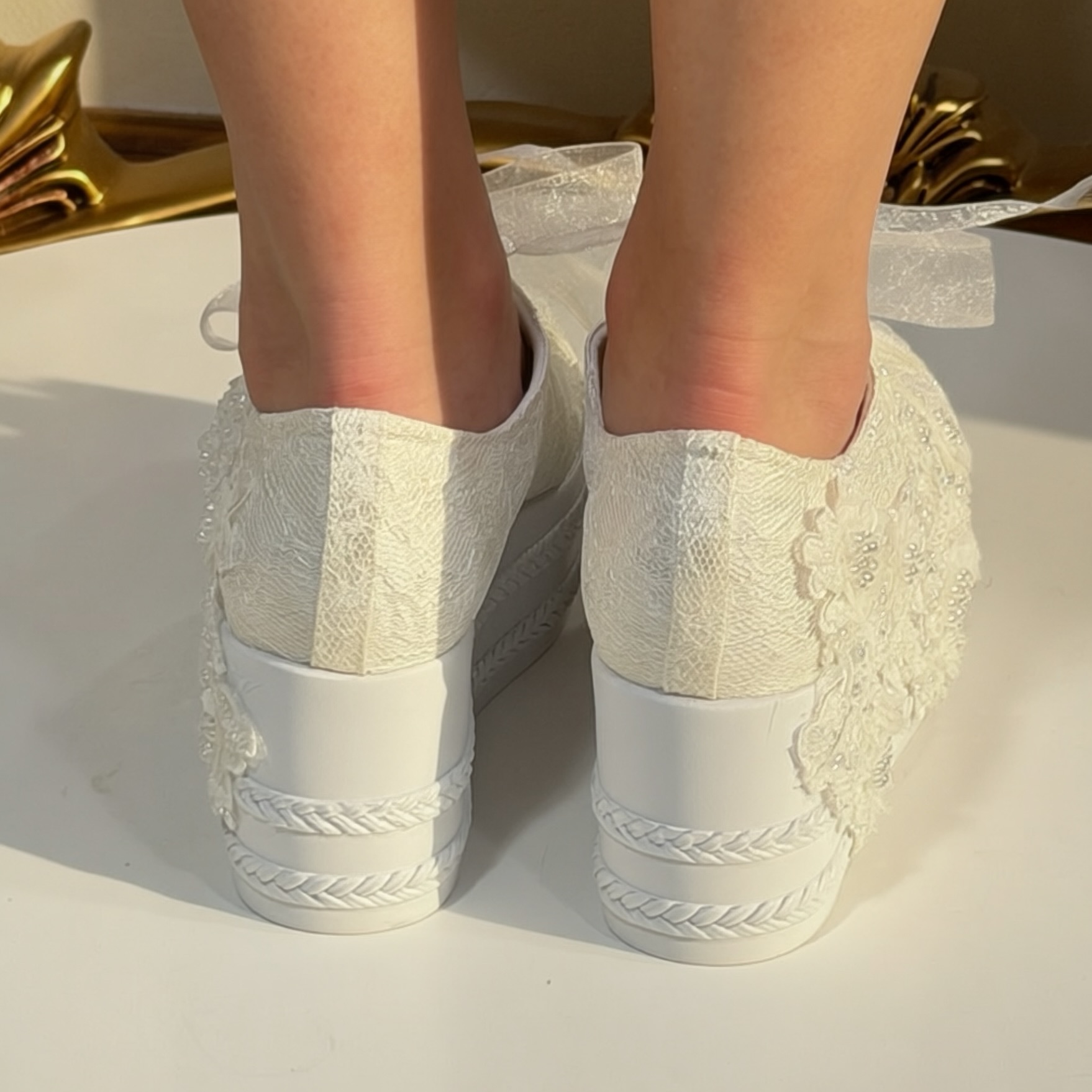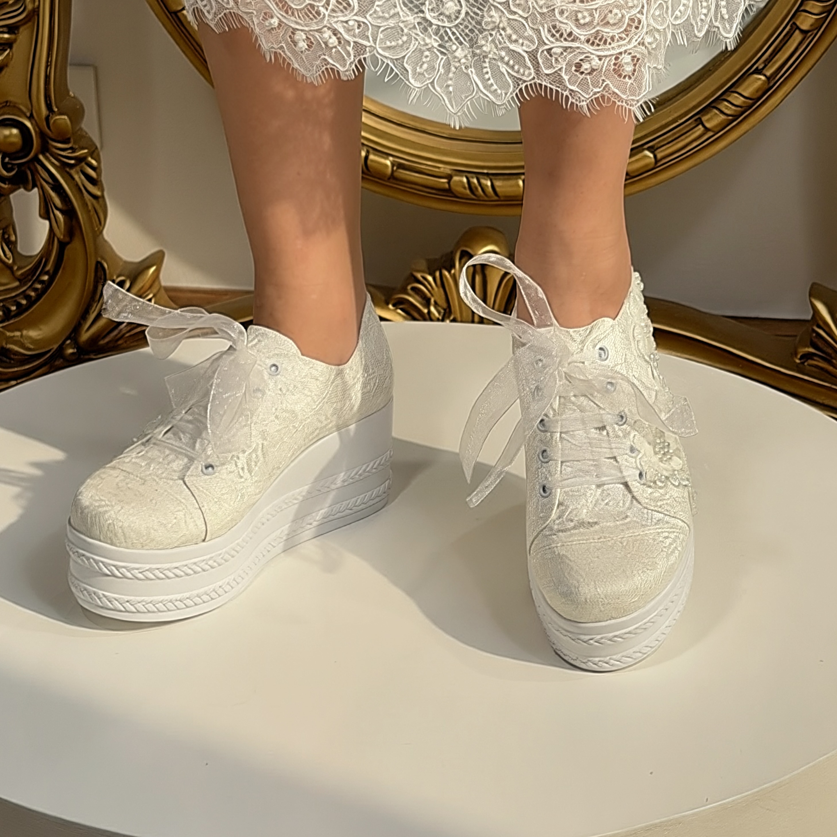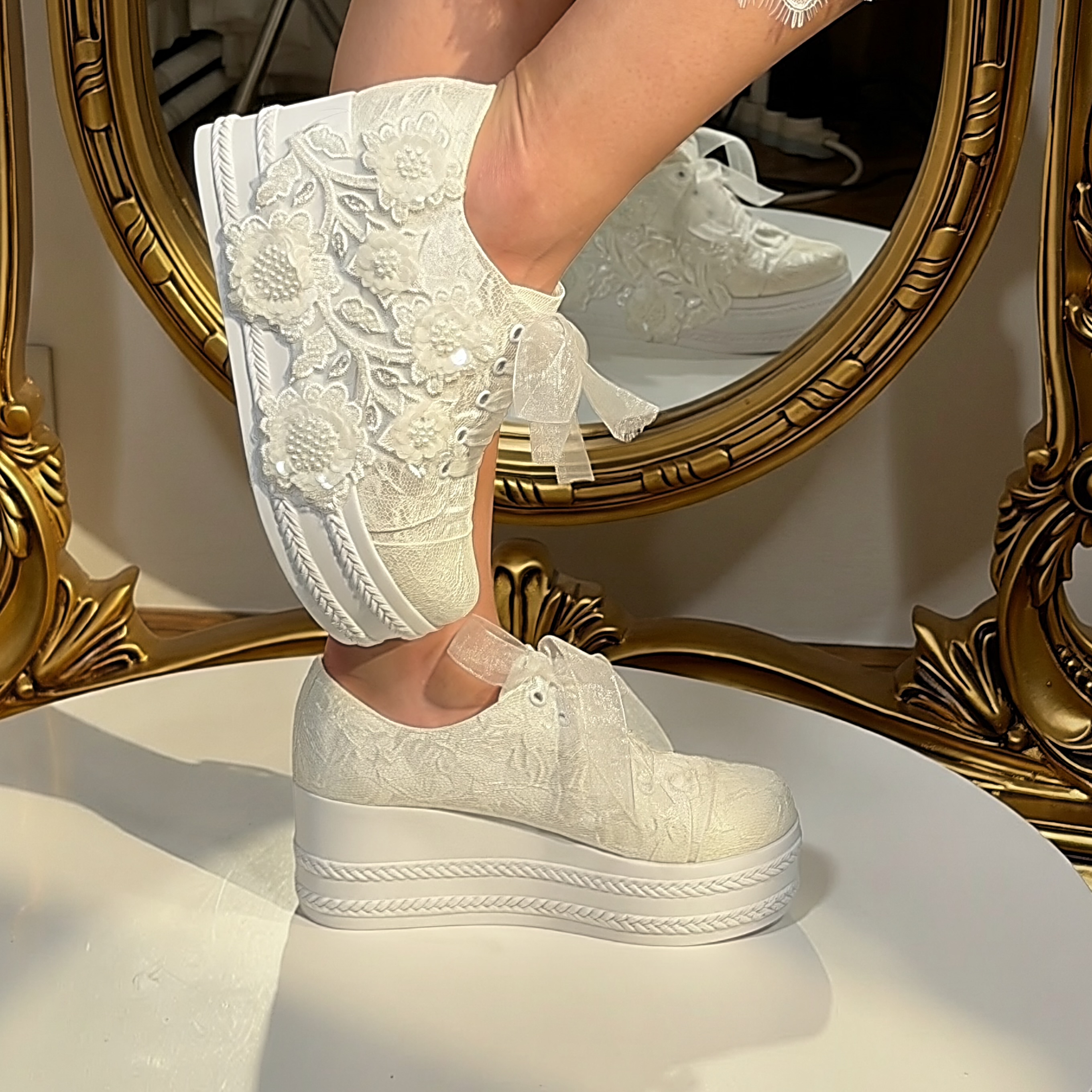 Pantofii sport de mireasă Spice sunt realizați din canvas îmbrăcat în dantelă și broderie, cu aplicații florale și șireturi din organza. Talpa tip platformă oferă înălțime, păstrând confortul pe tot parcursul purtării.