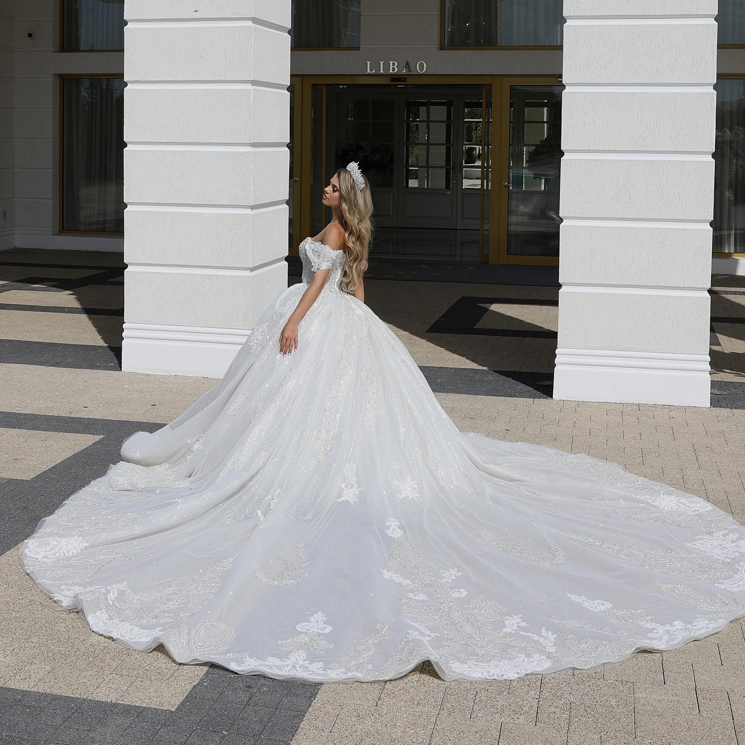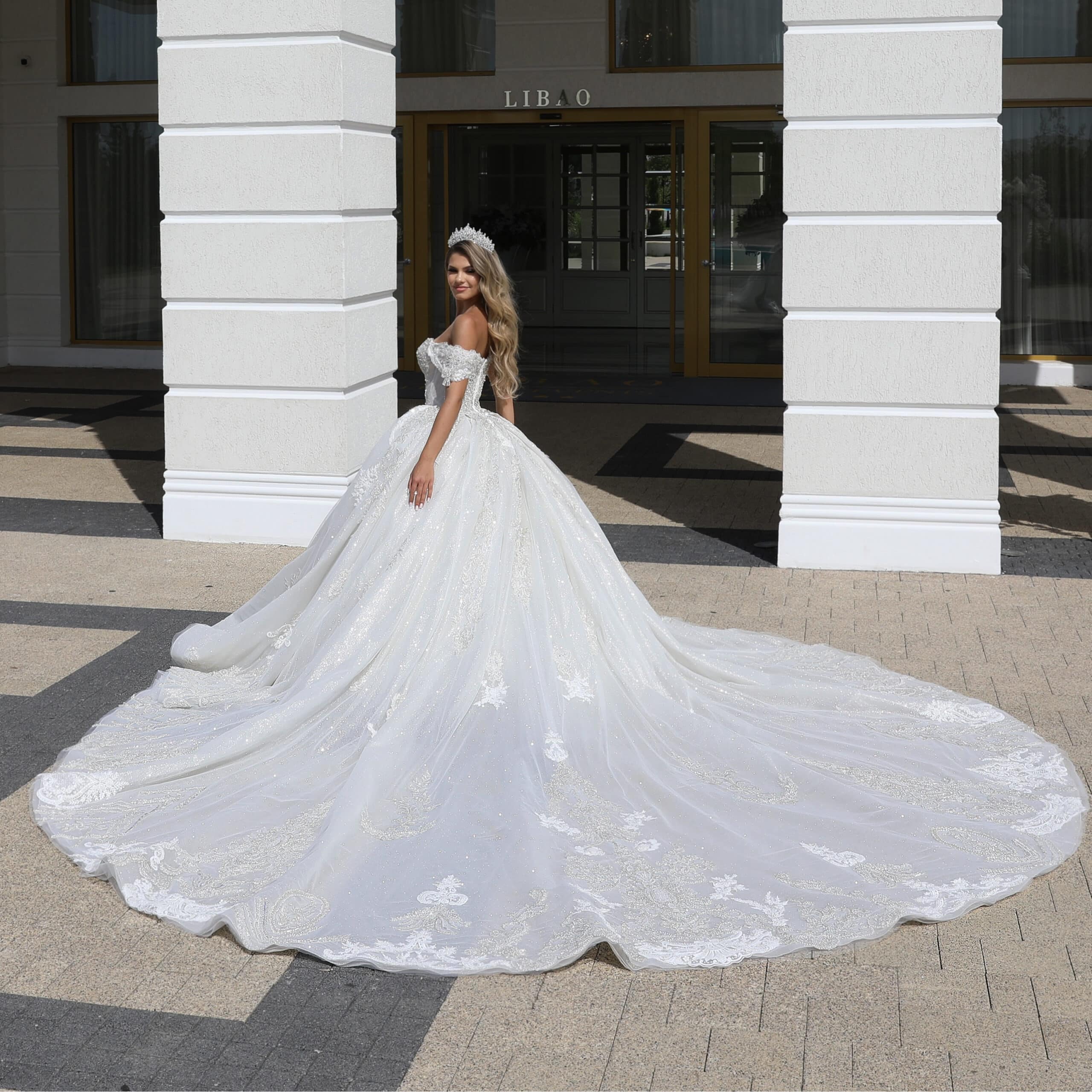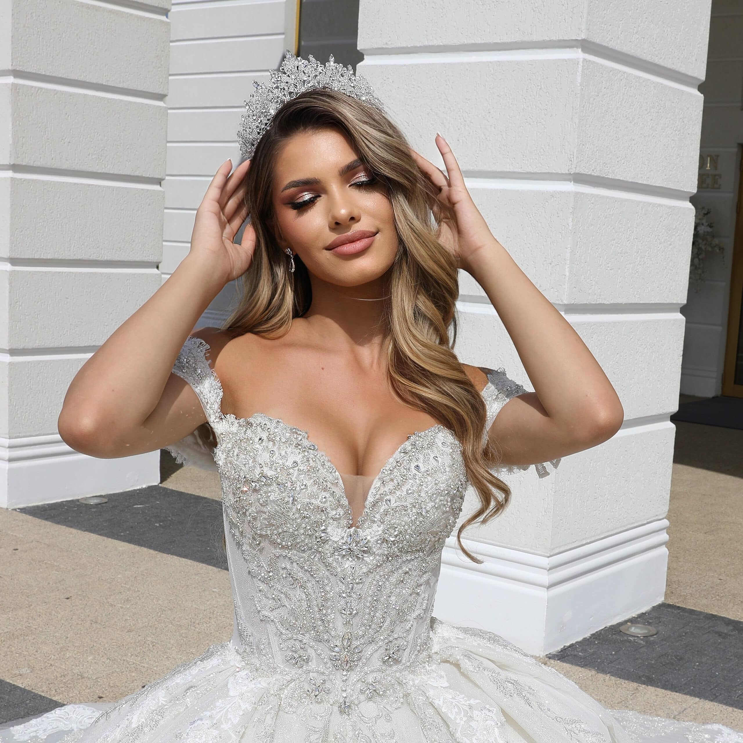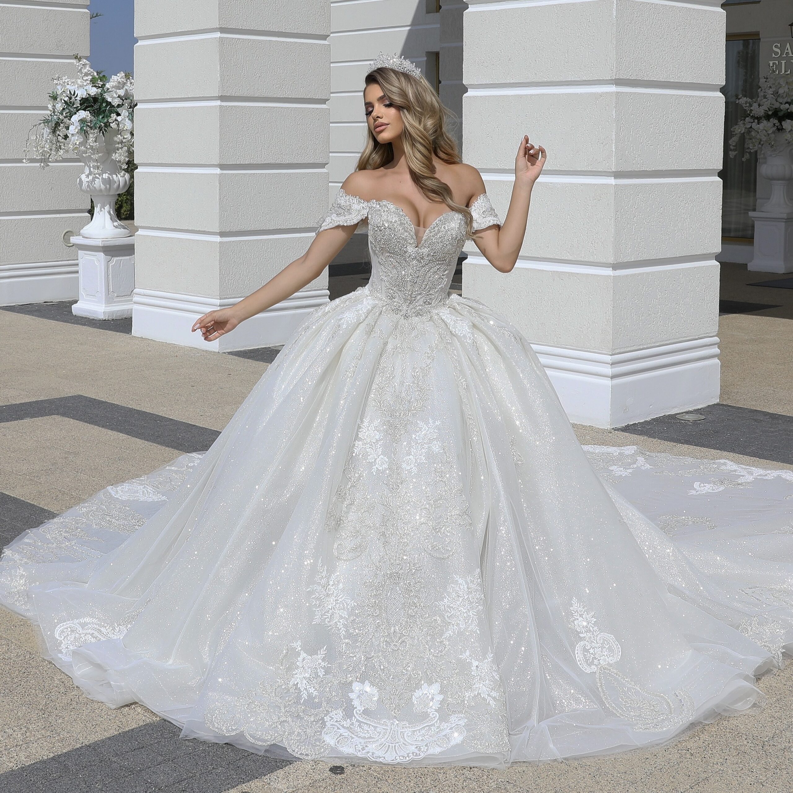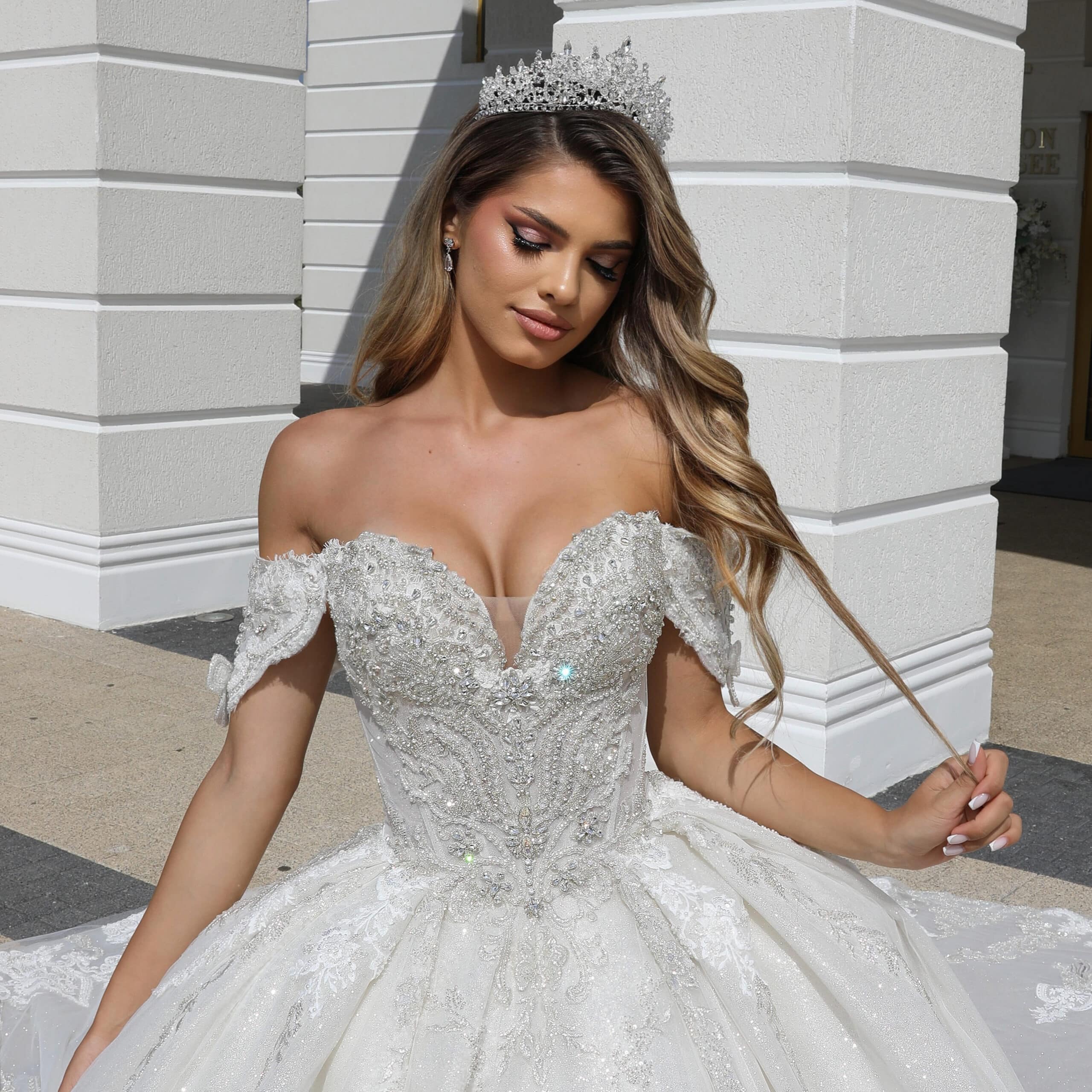 Rochie de mireasa stil printesa, bufanta, cu sclipici si broderie cusuta manual cu pietre tip zirconiu si perle.