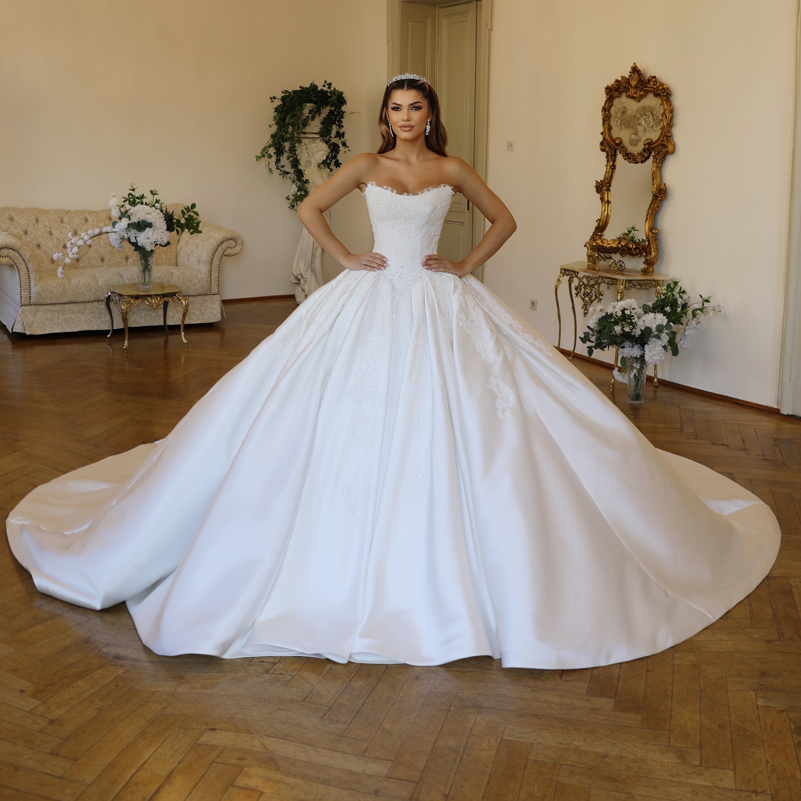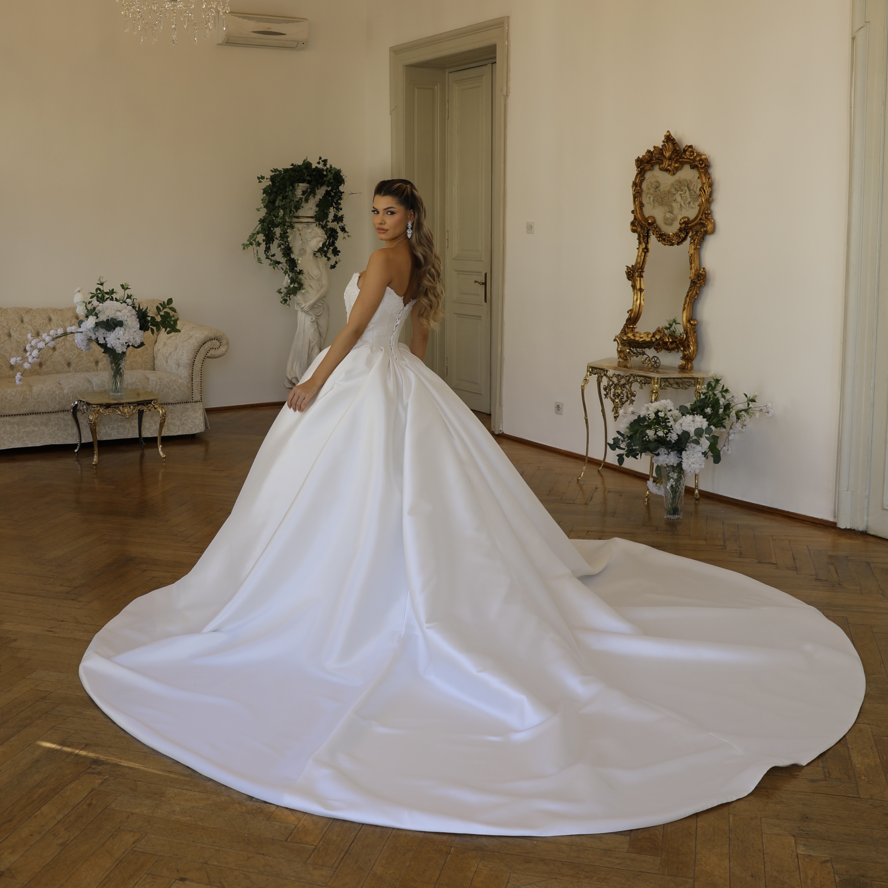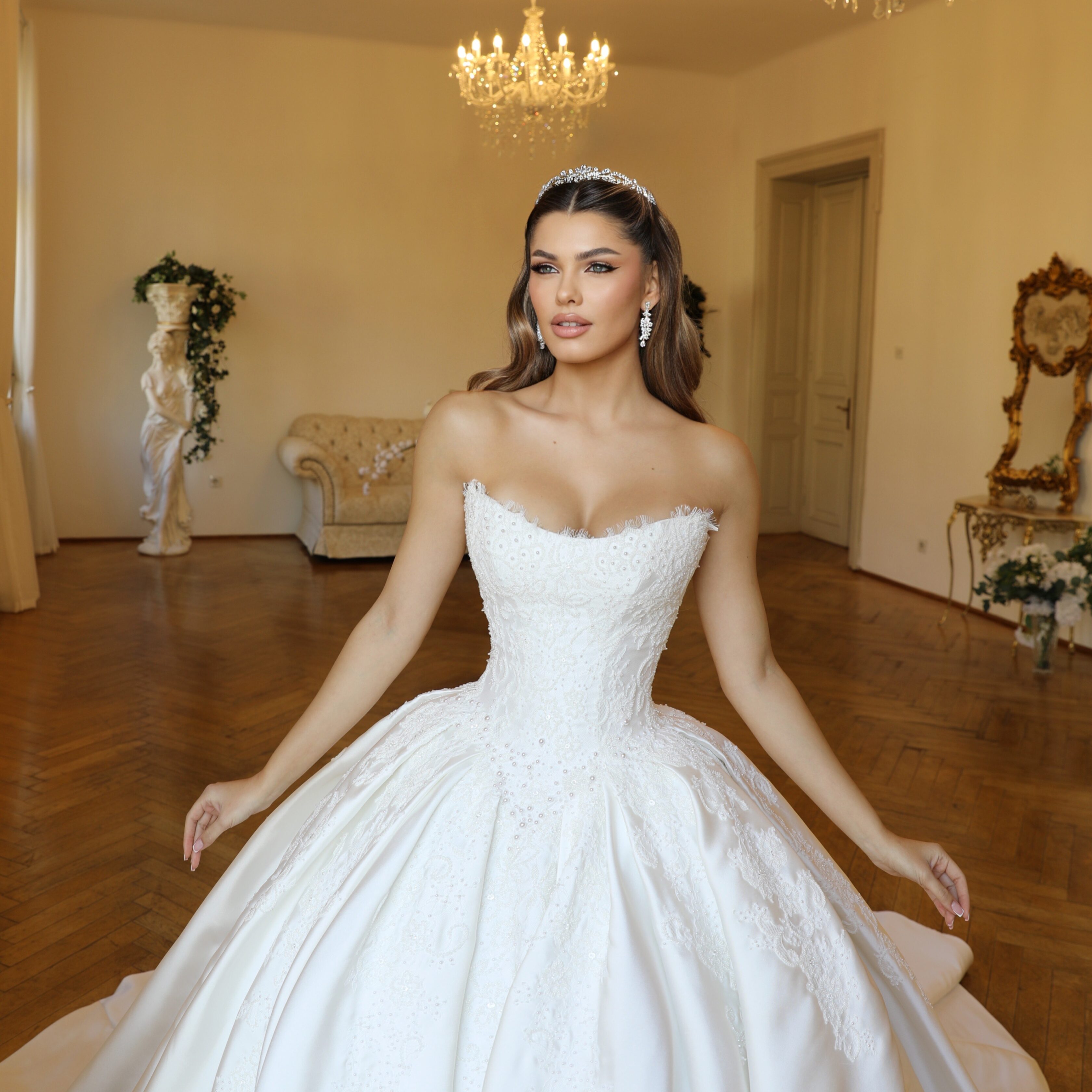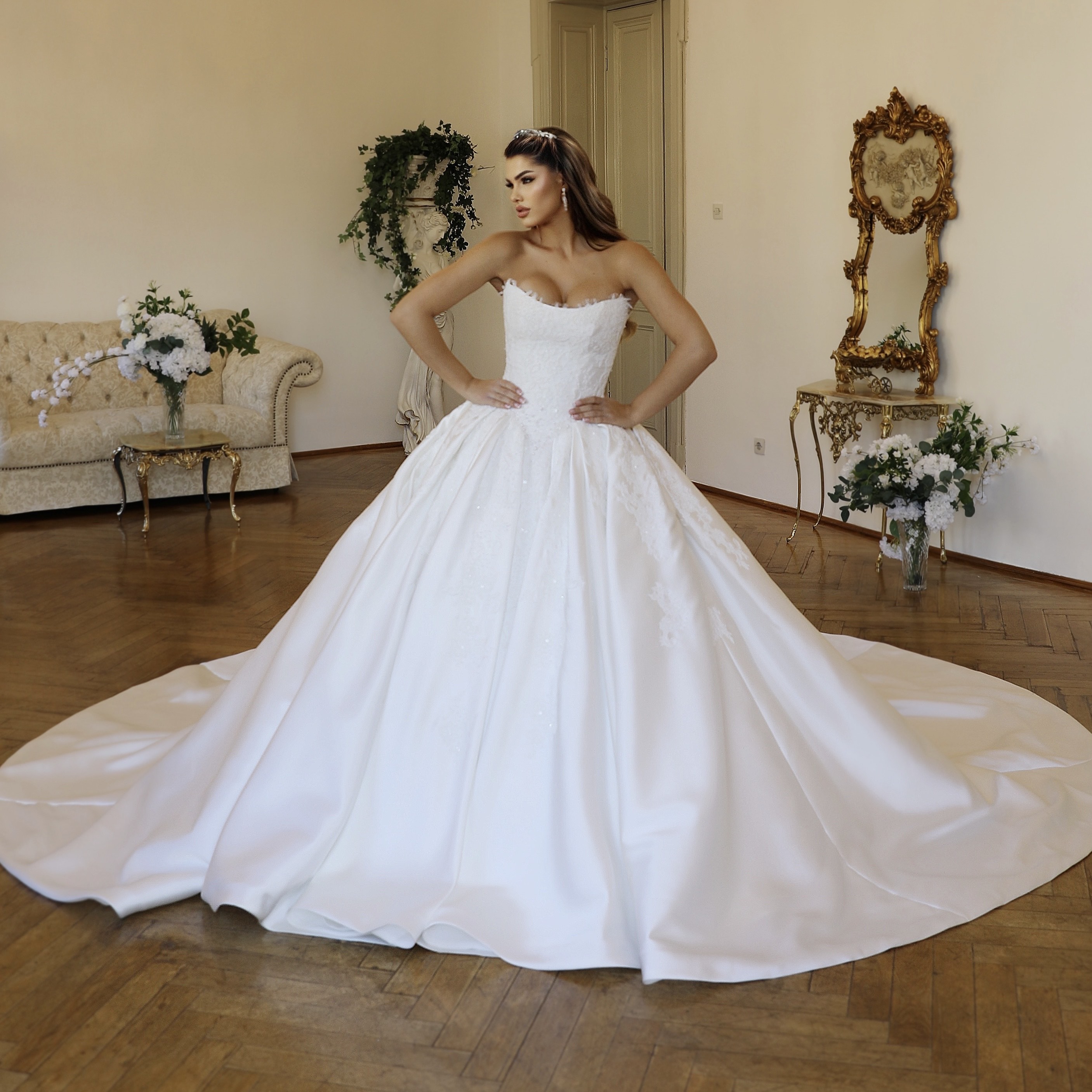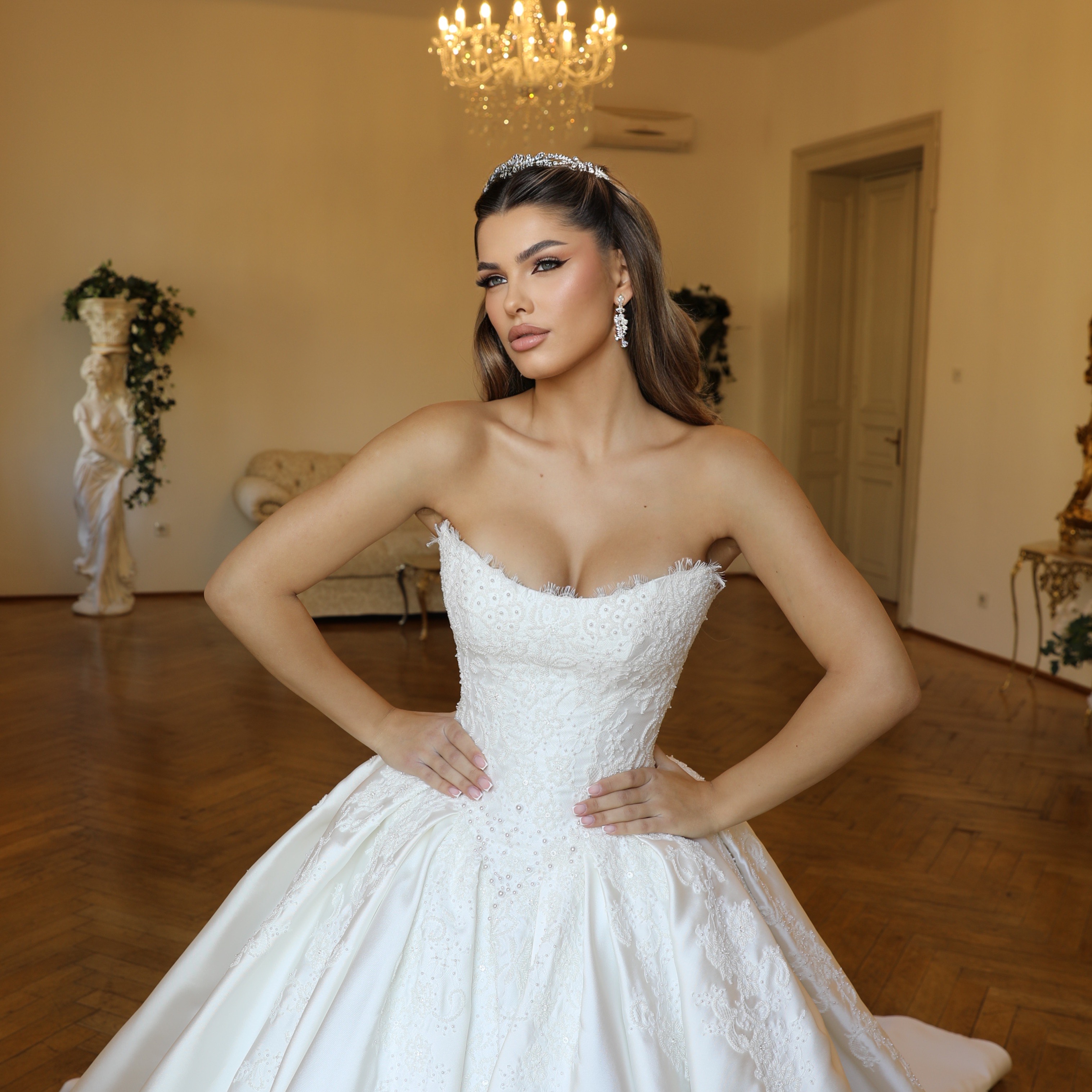 Rochia Marine îmbină perfect luxul materialelor nobile cu delicatețea dantelei lucrate manual. Este alegerea ideală pentru mireasa care visează la o apariție impunătoare, plină de lumină și grație.