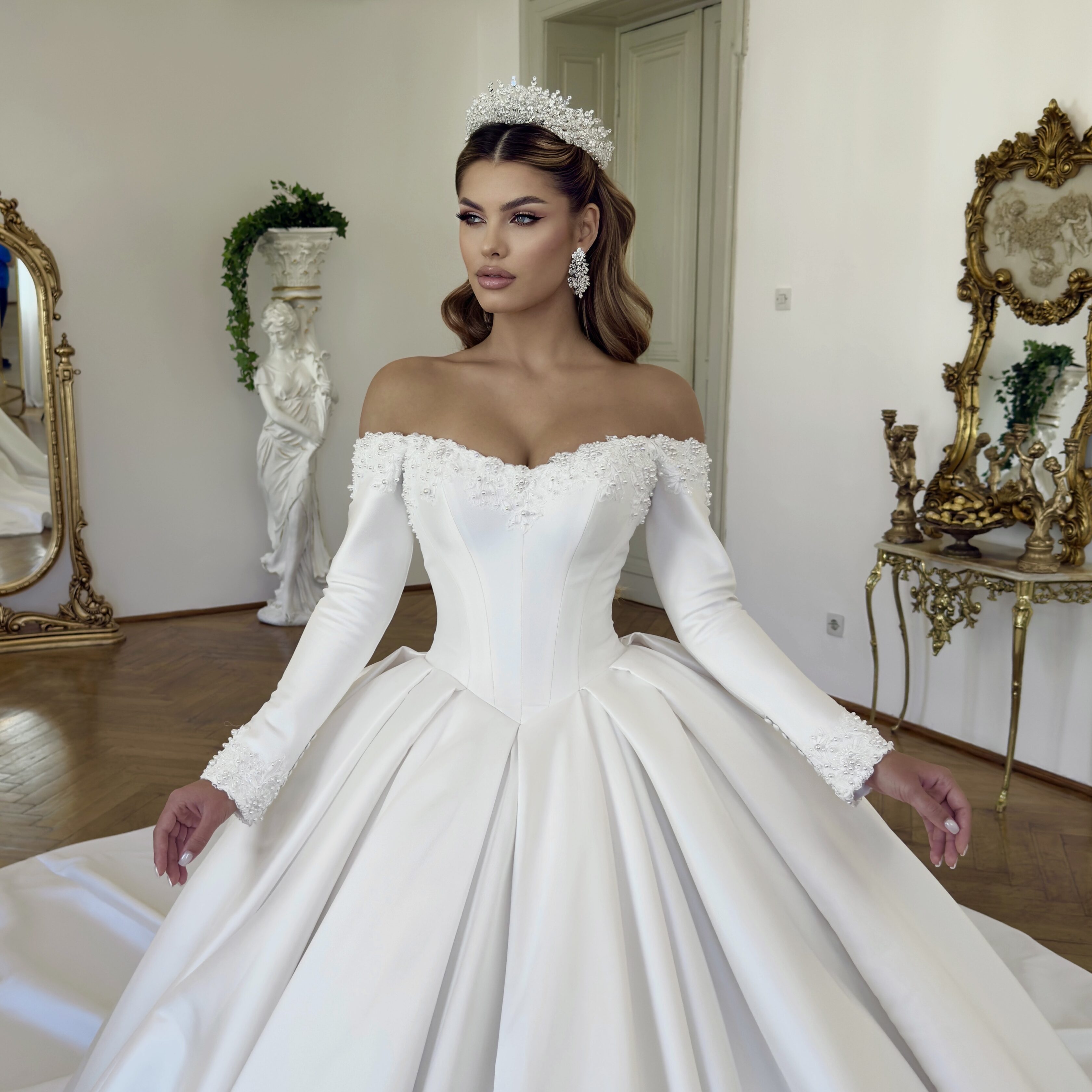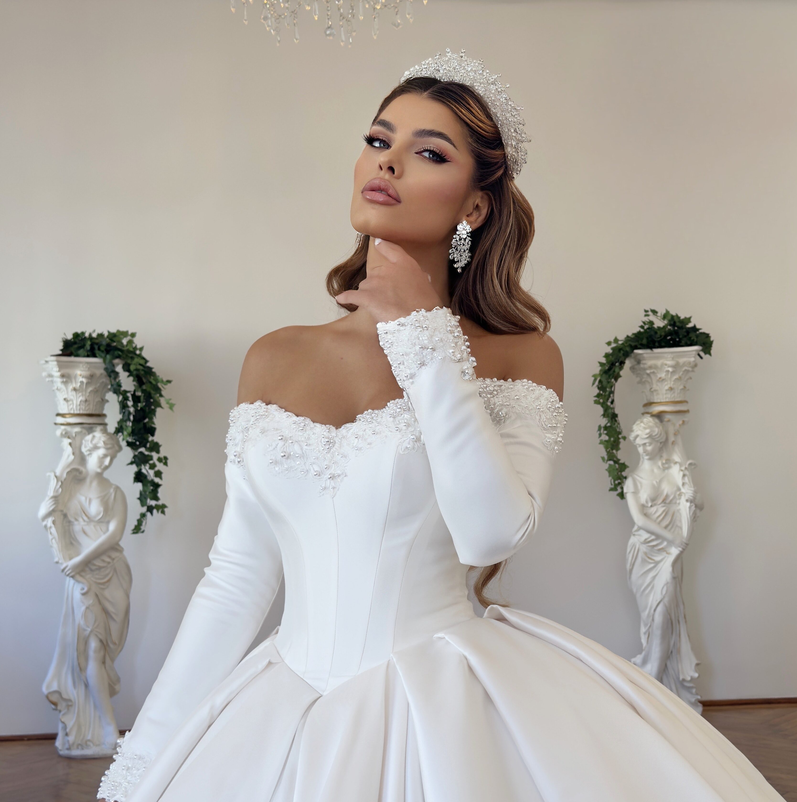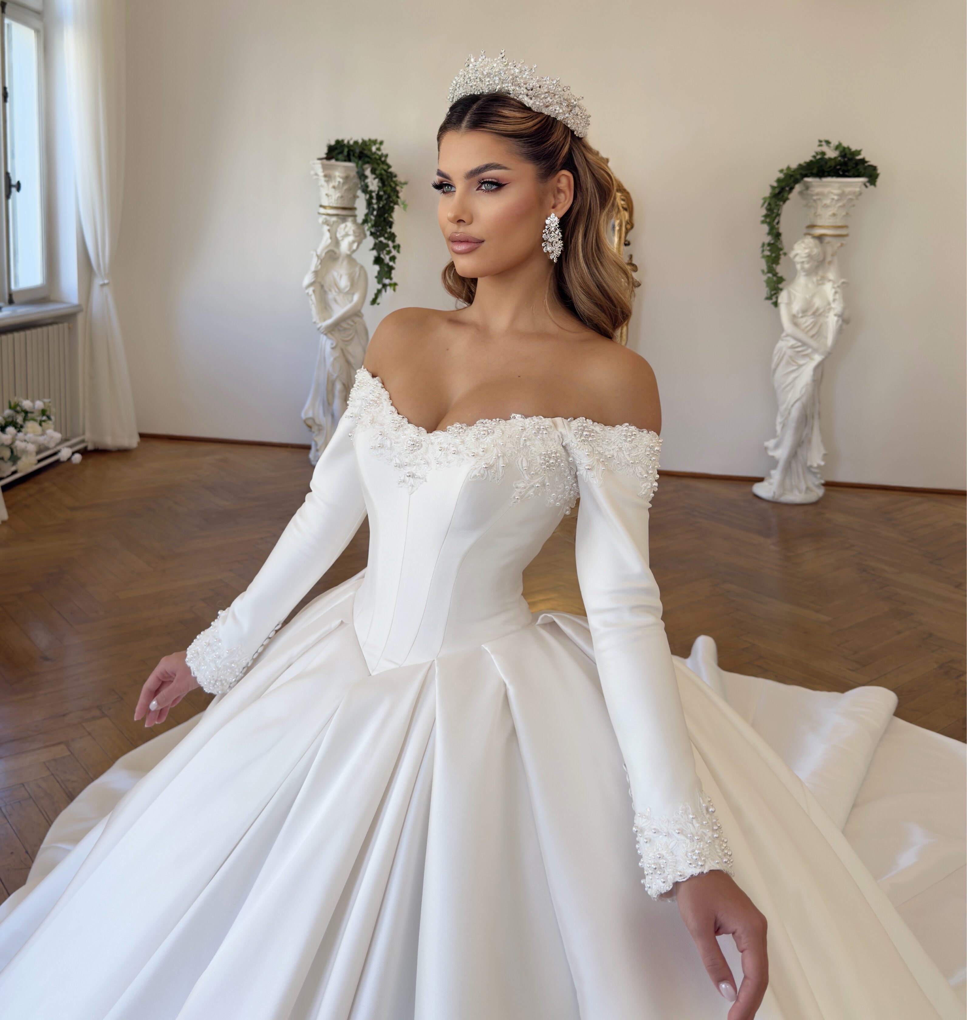Rochia are mâneci lungi din tafta Mikado, brodate la încheietură cu dantelă și perle. Broderia de la manșete atrage atenția pe partea inferioară a brațului, ceea ce creează un efect vizual de brațe mai subțiri.