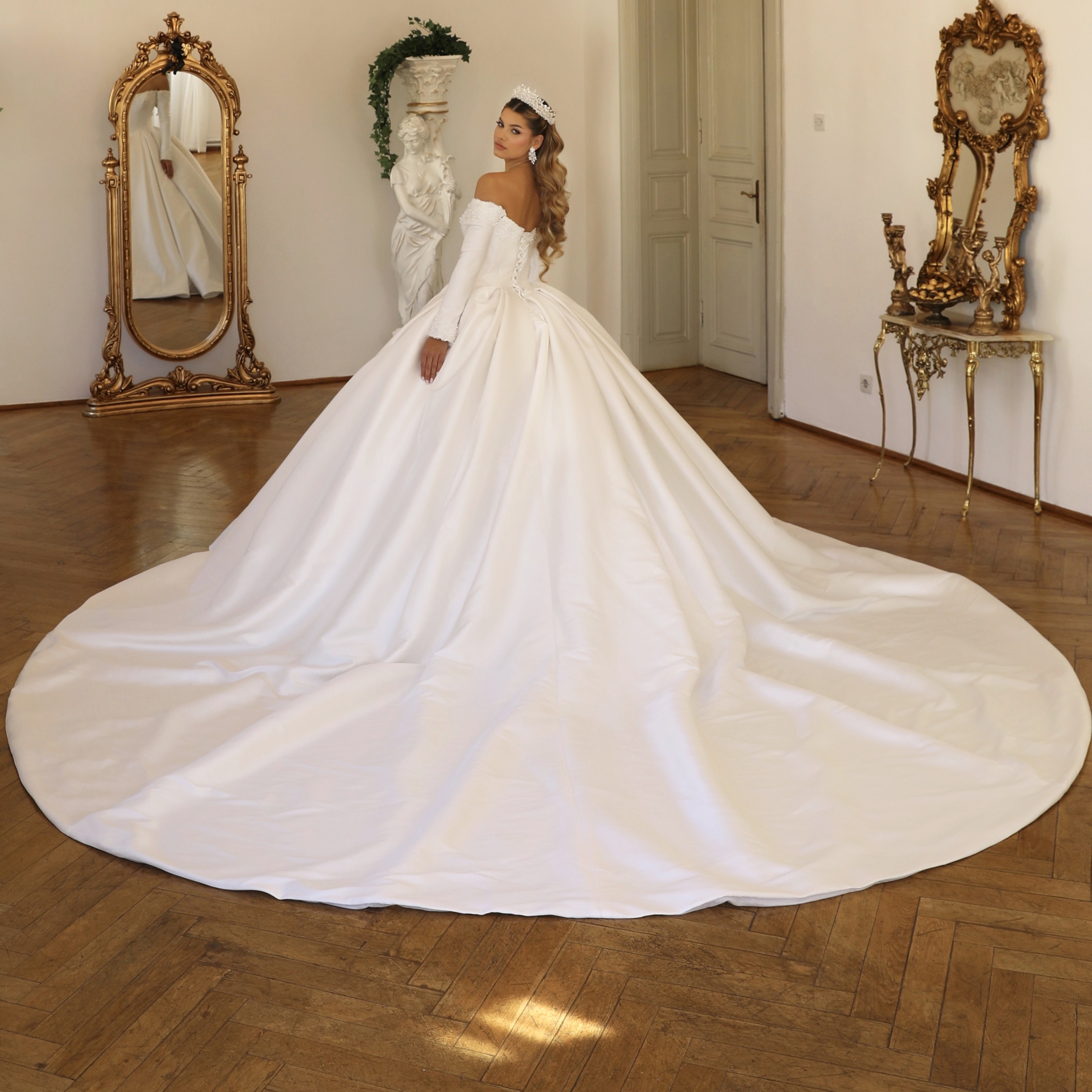 Fusta este foarte amplă, formată din straturi de Mikado, iar la spate rochia se prelungește într-o trenă regală cu sistem de prindere, utilă în momentele de dans sau atunci când mireasa are nevoie să se miște mai lejer.