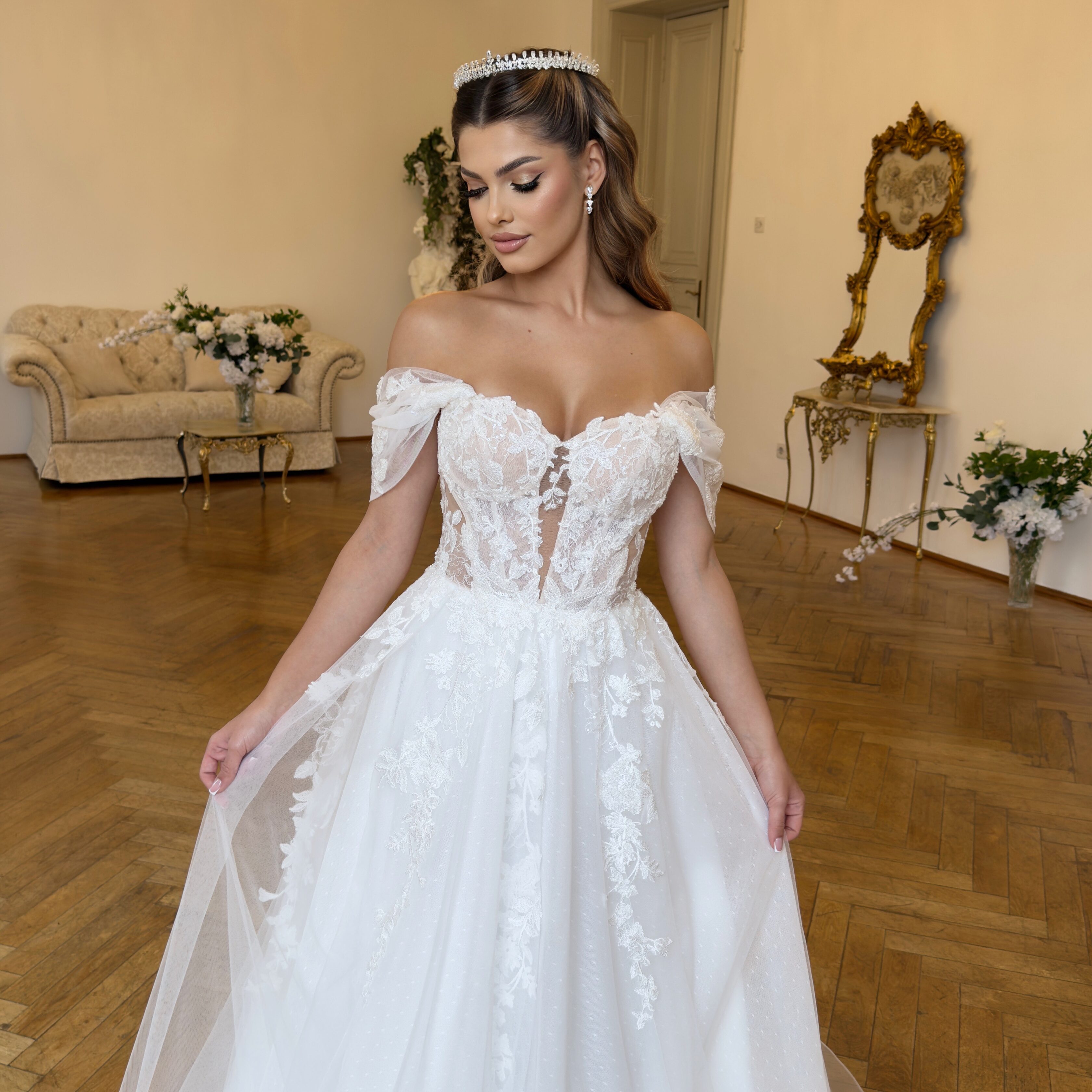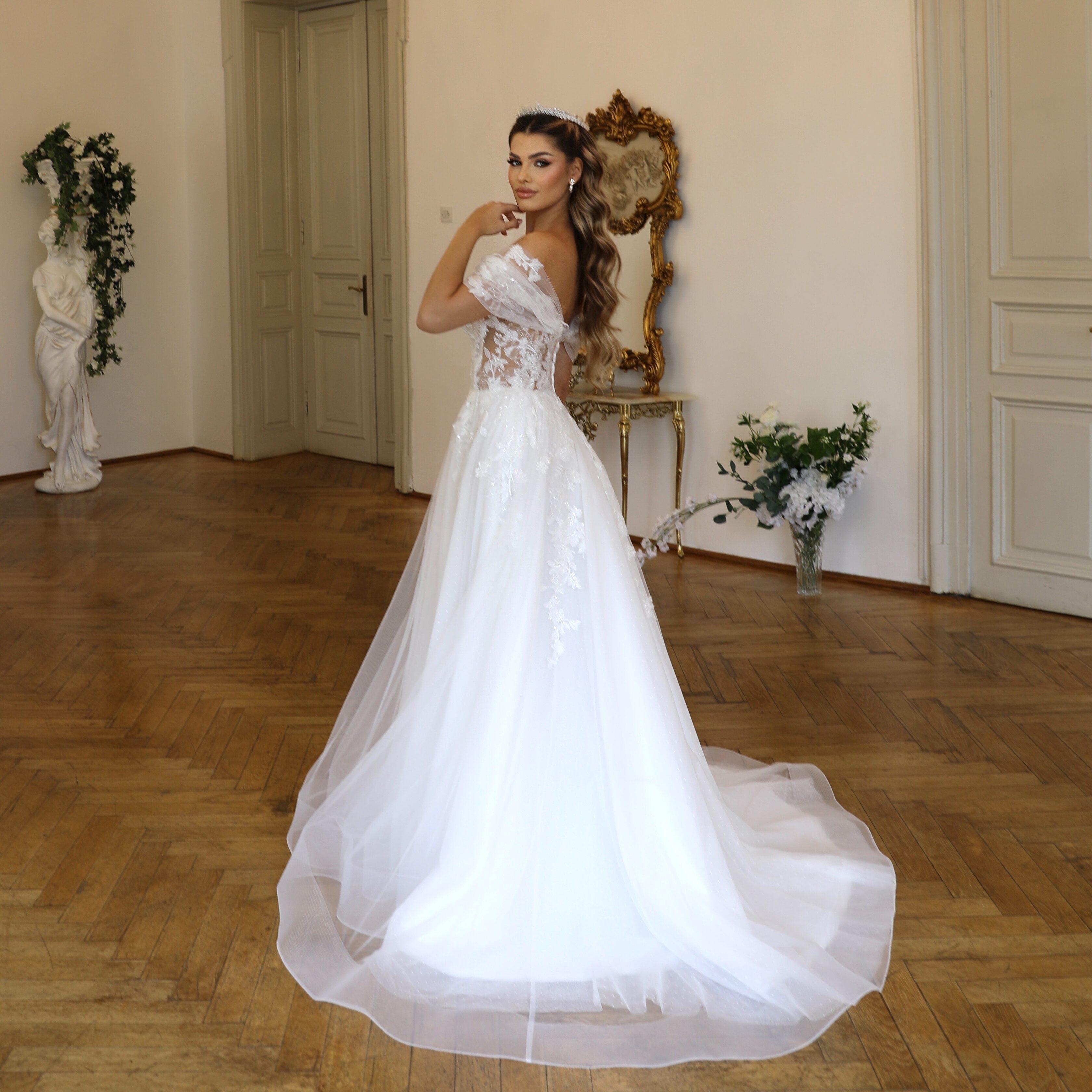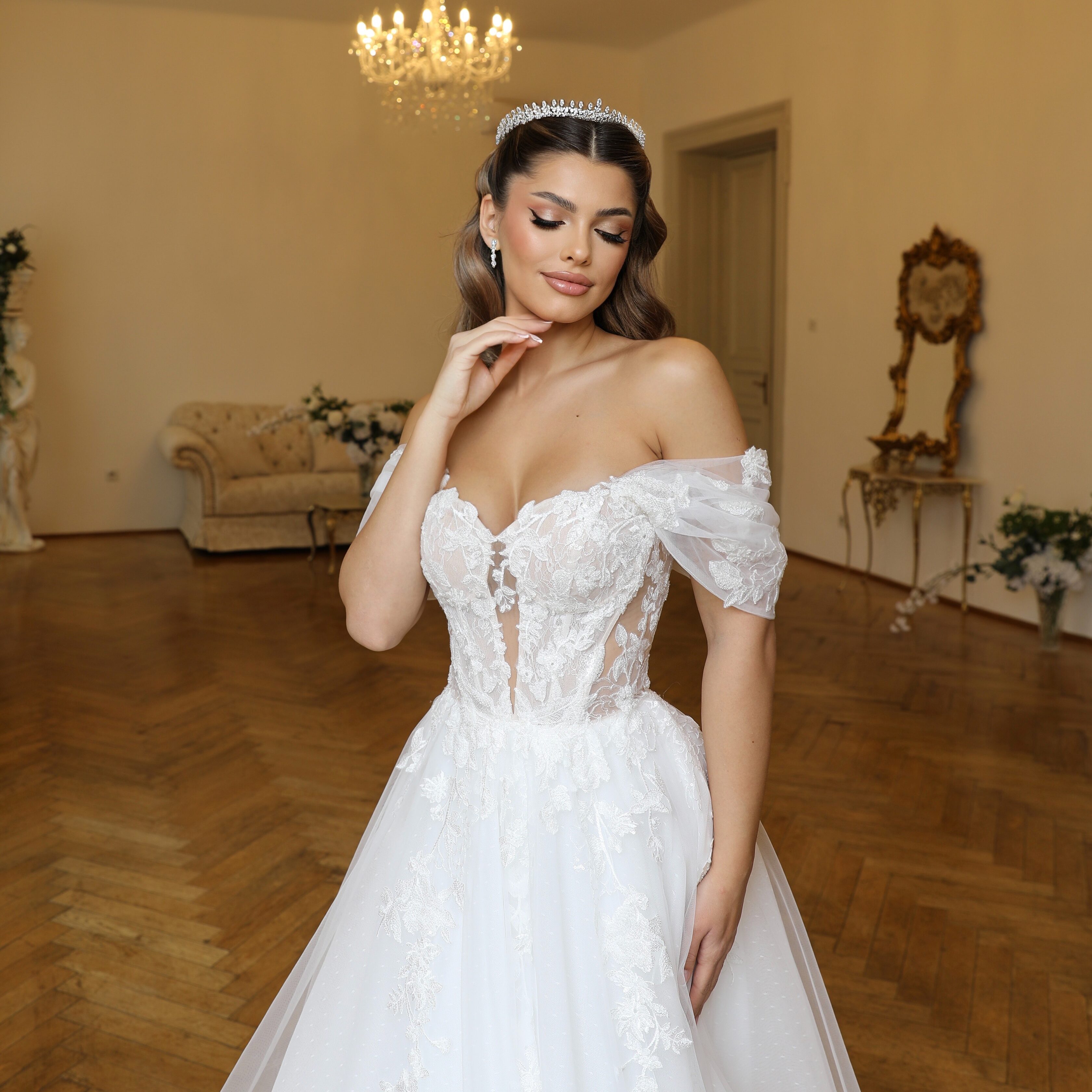Mia este alegerea perfectă pentru mireasa liberă, delicată și visătoare — o rochie în care simplitatea devine artă, iar naturalețea devine rafinament.