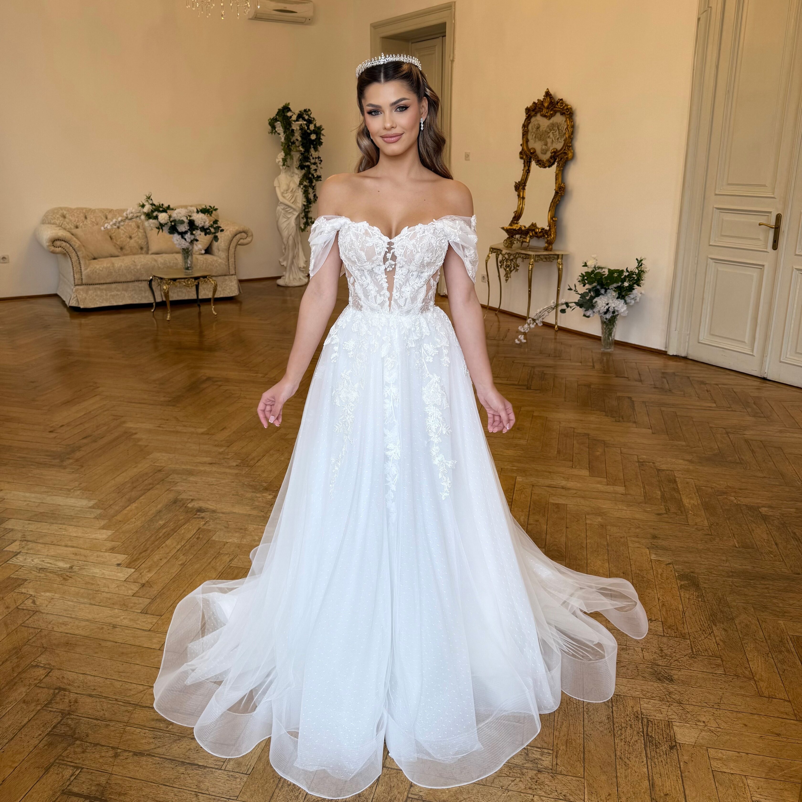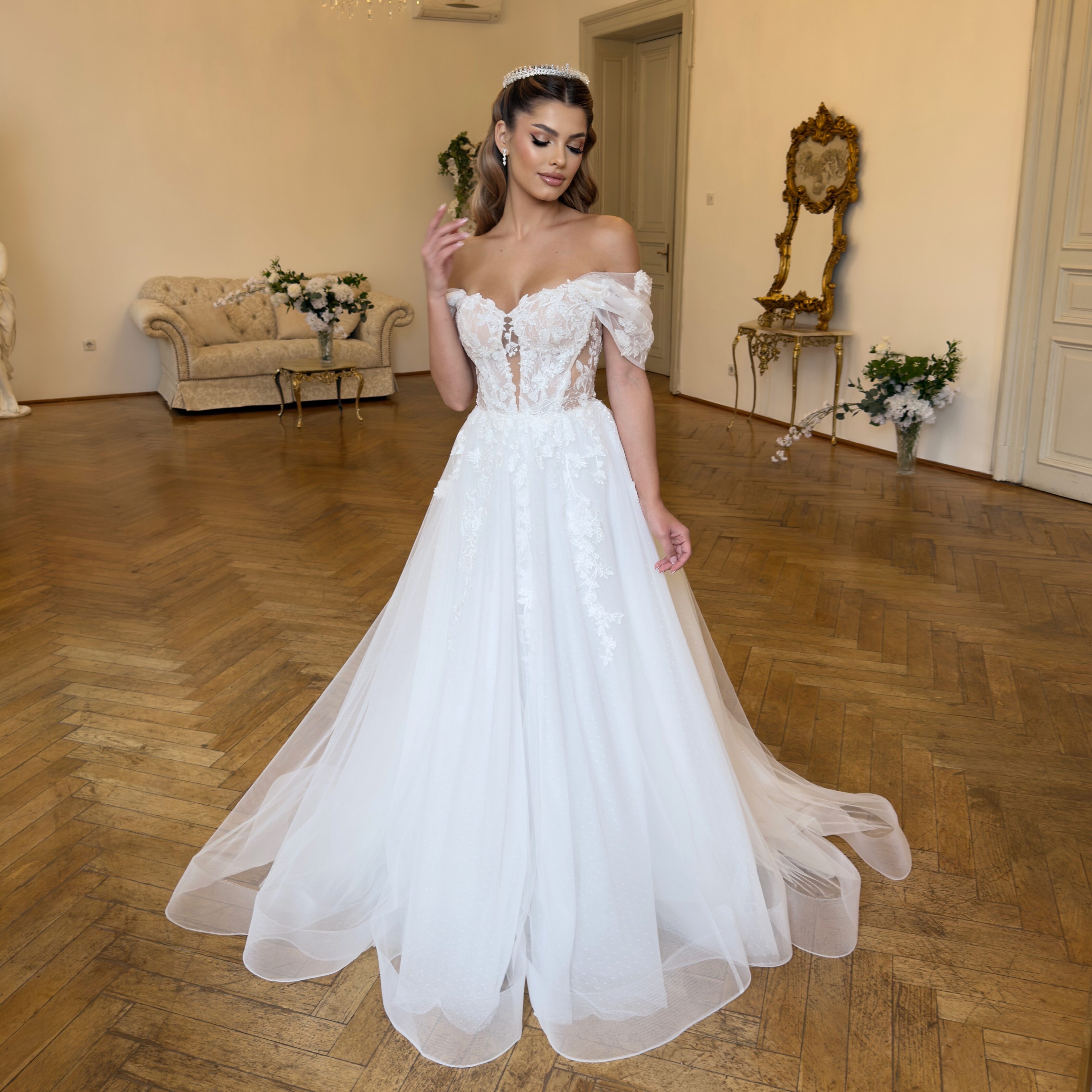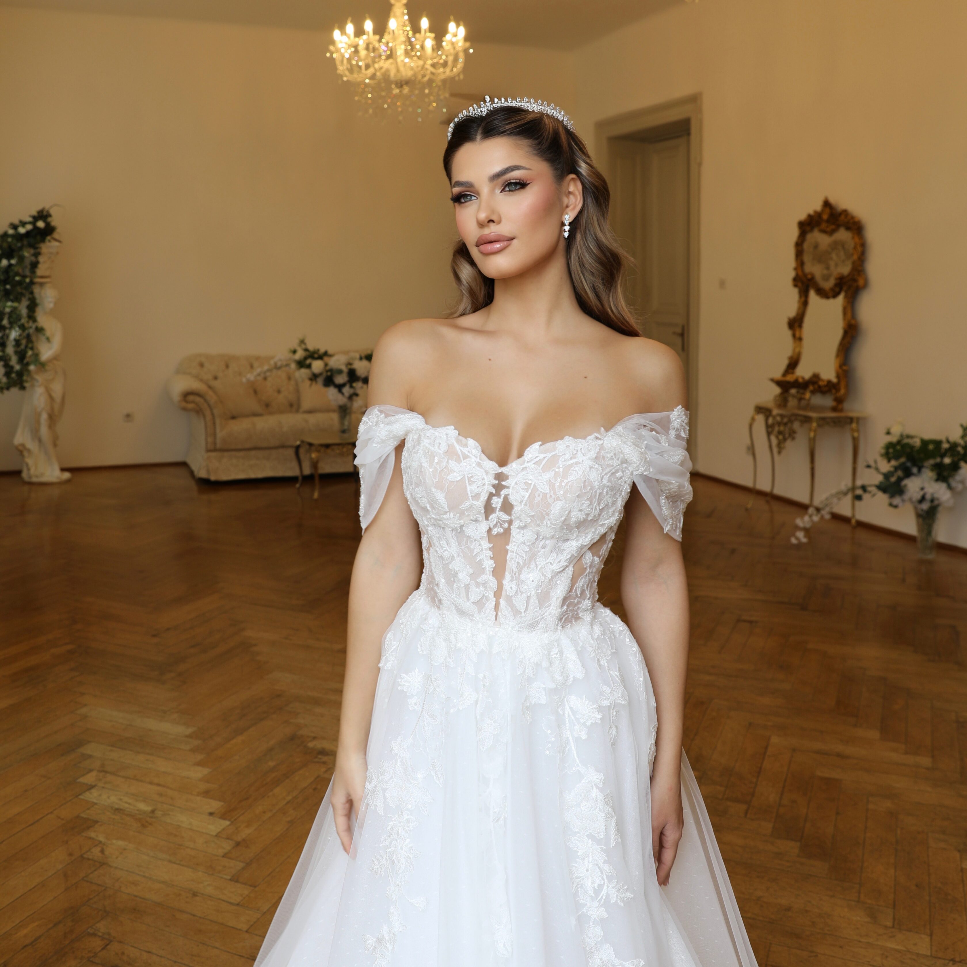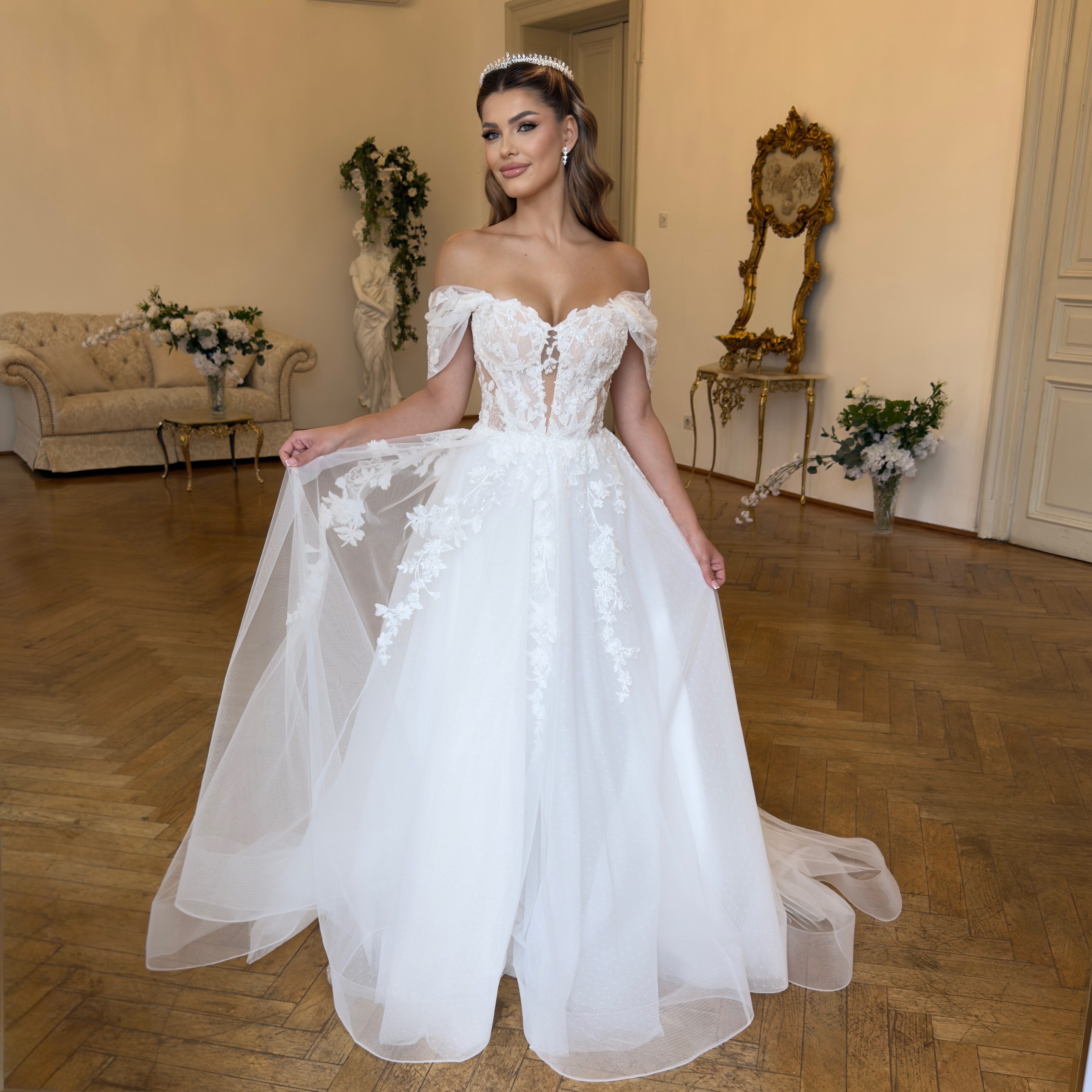 Mia este alegerea perfectă pentru mireasa liberă, delicată și visătoare — o rochie în care simplitatea devine artă, iar naturalețea devine rafinament.