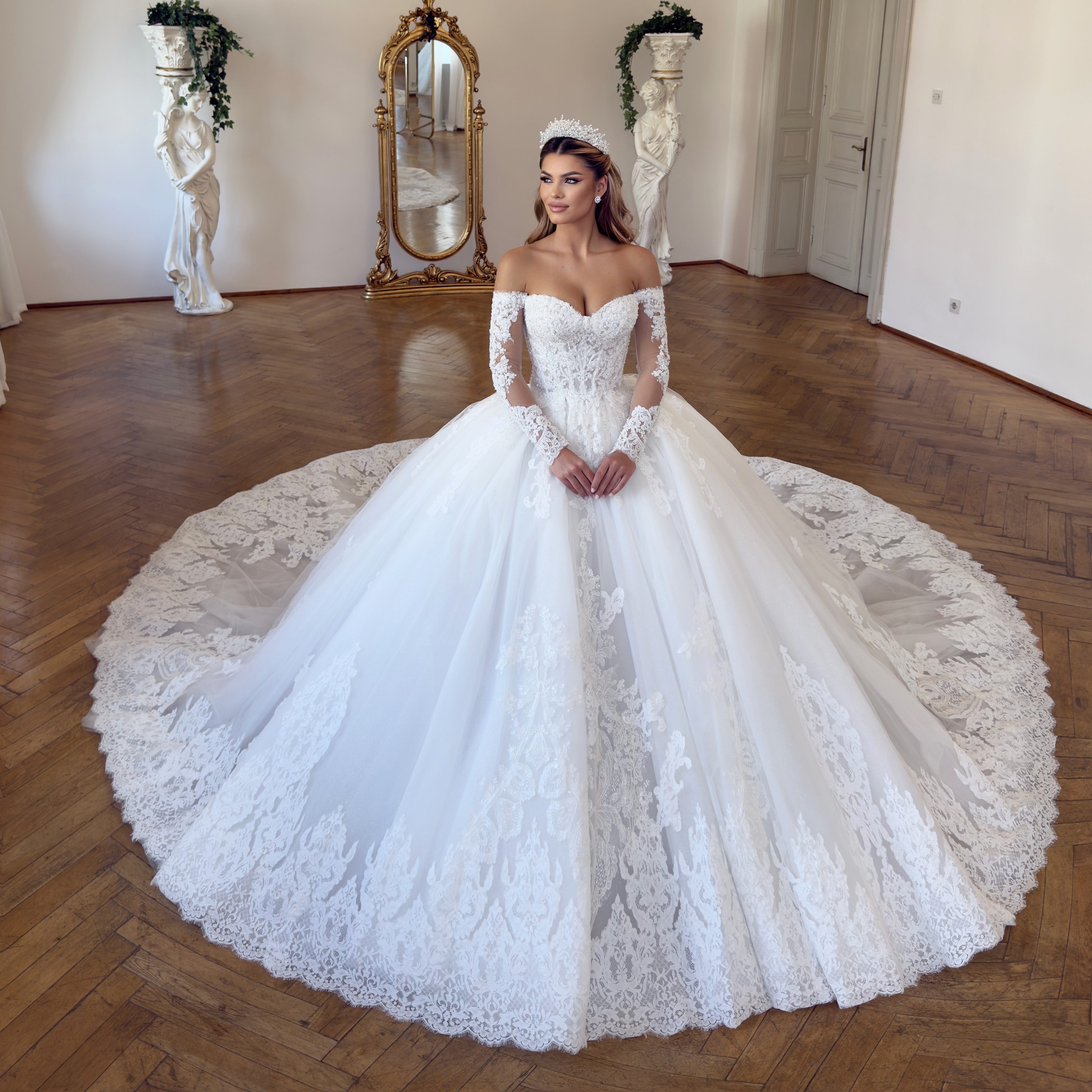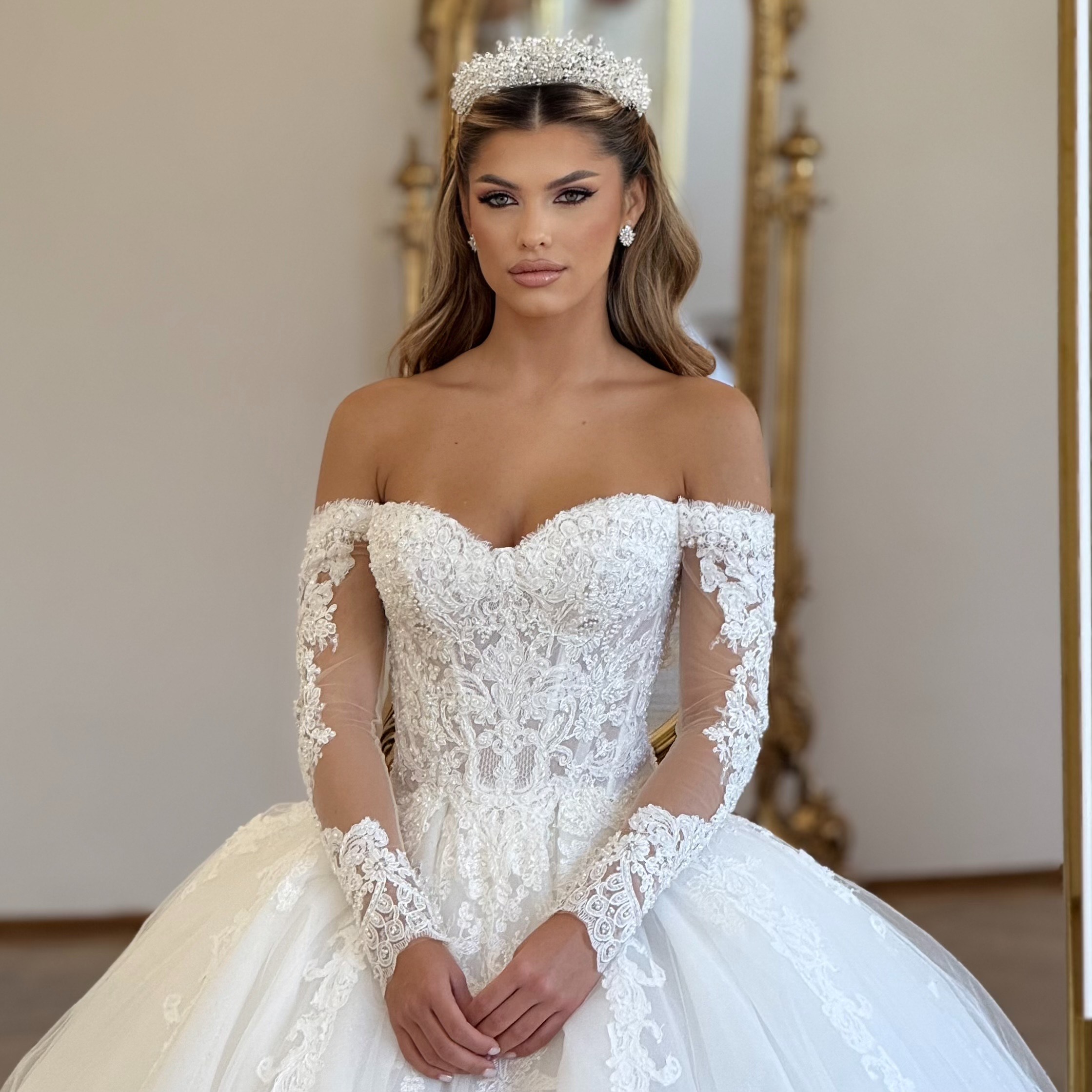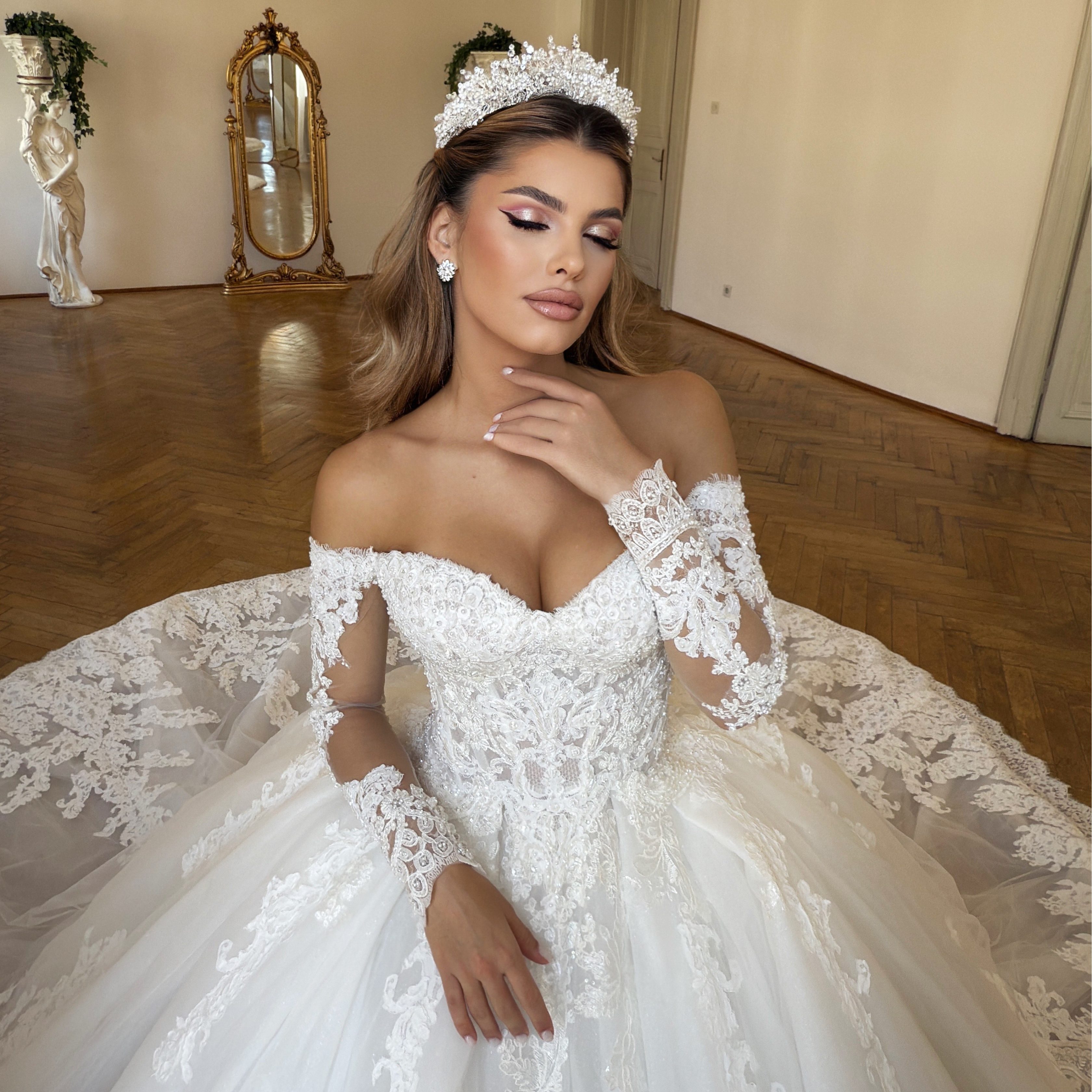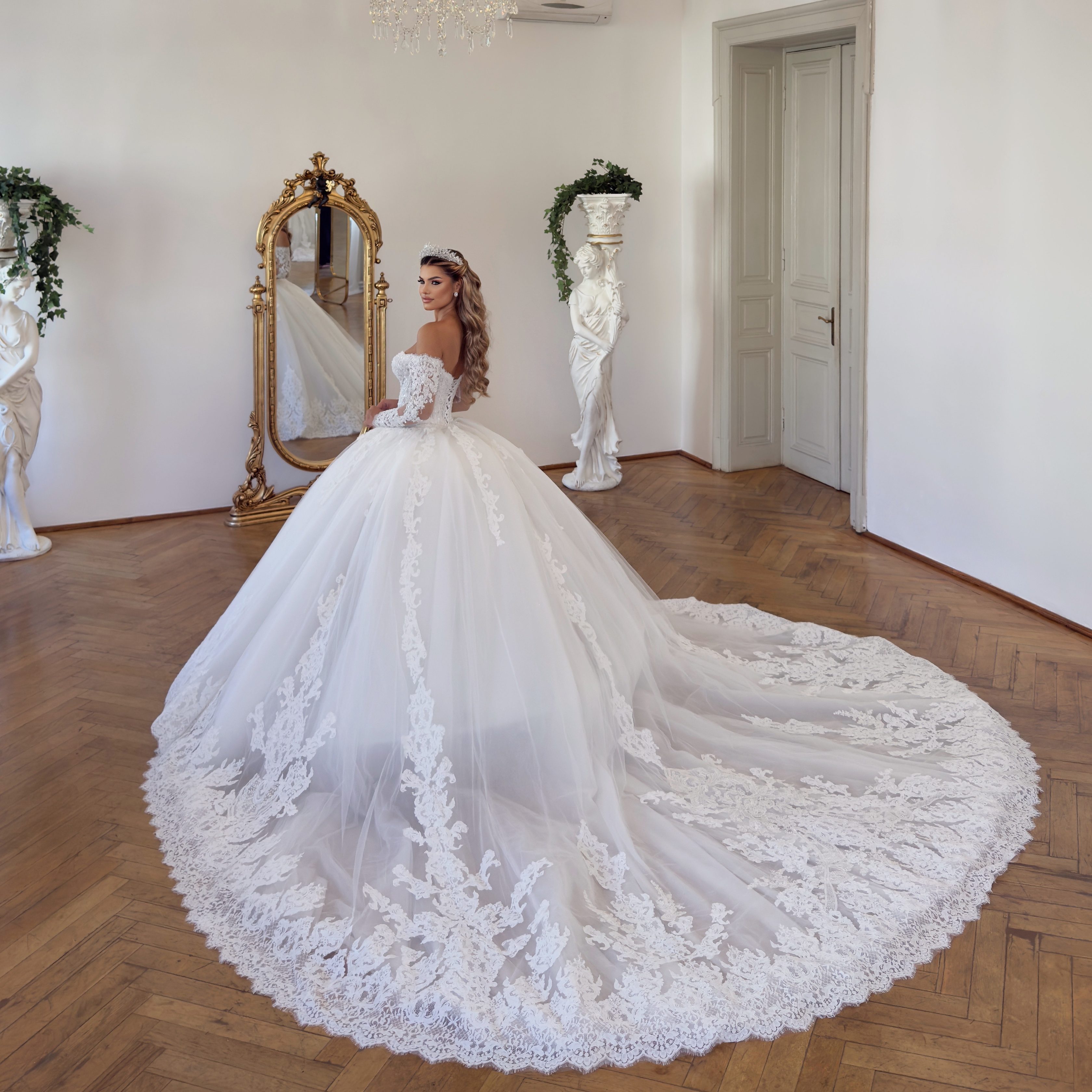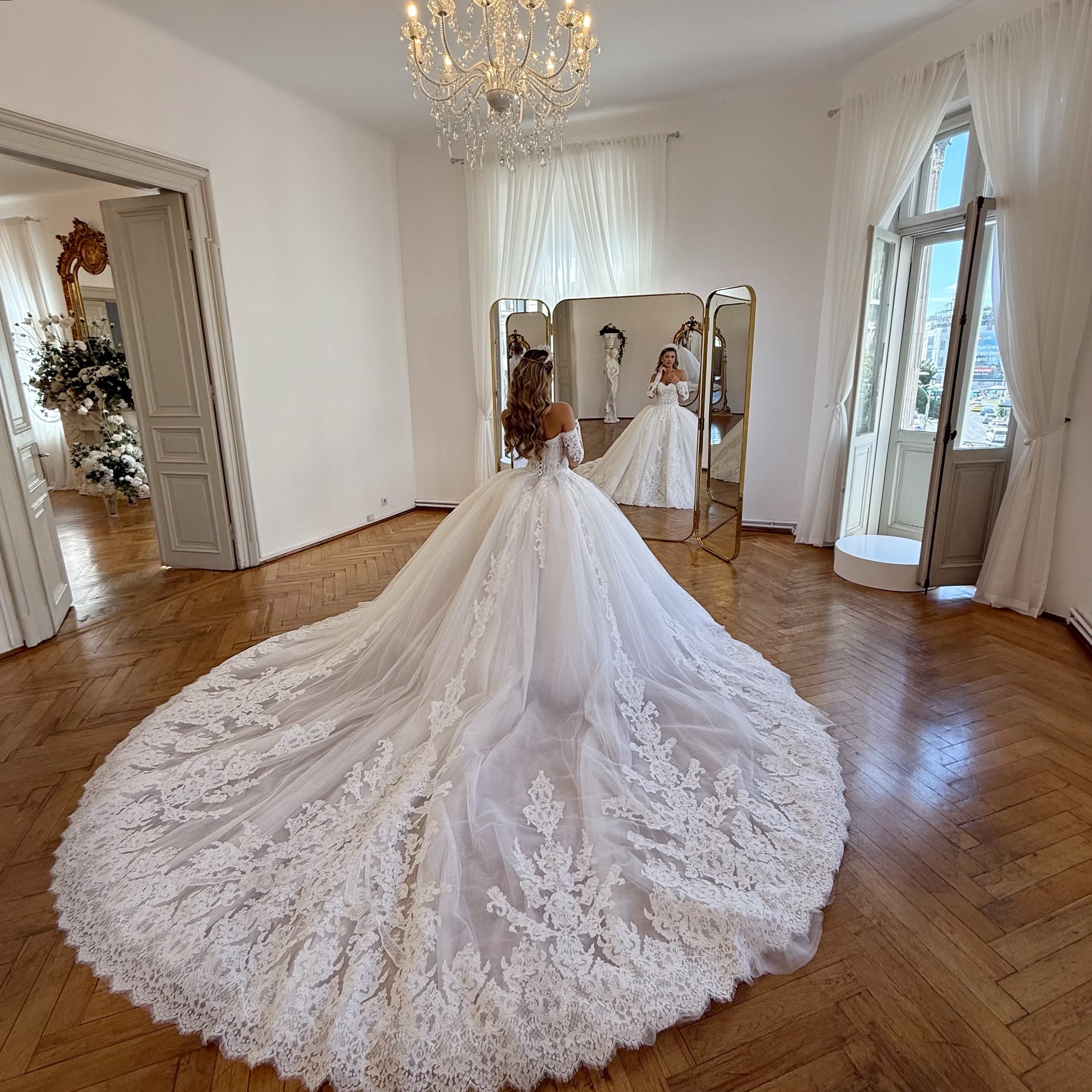 Manecile lungi, din dantelă Chantilly rebrodată, sunt cusute manual cu perle miniaturale și cristale fine, iar broderia amplă creează iluzia unor brațe suple și elegante. Închiderea la spate este decorată cu nasturi sferici din cristal, un detaliu rafinat care adaugă un plus de strălucire și feminitate.