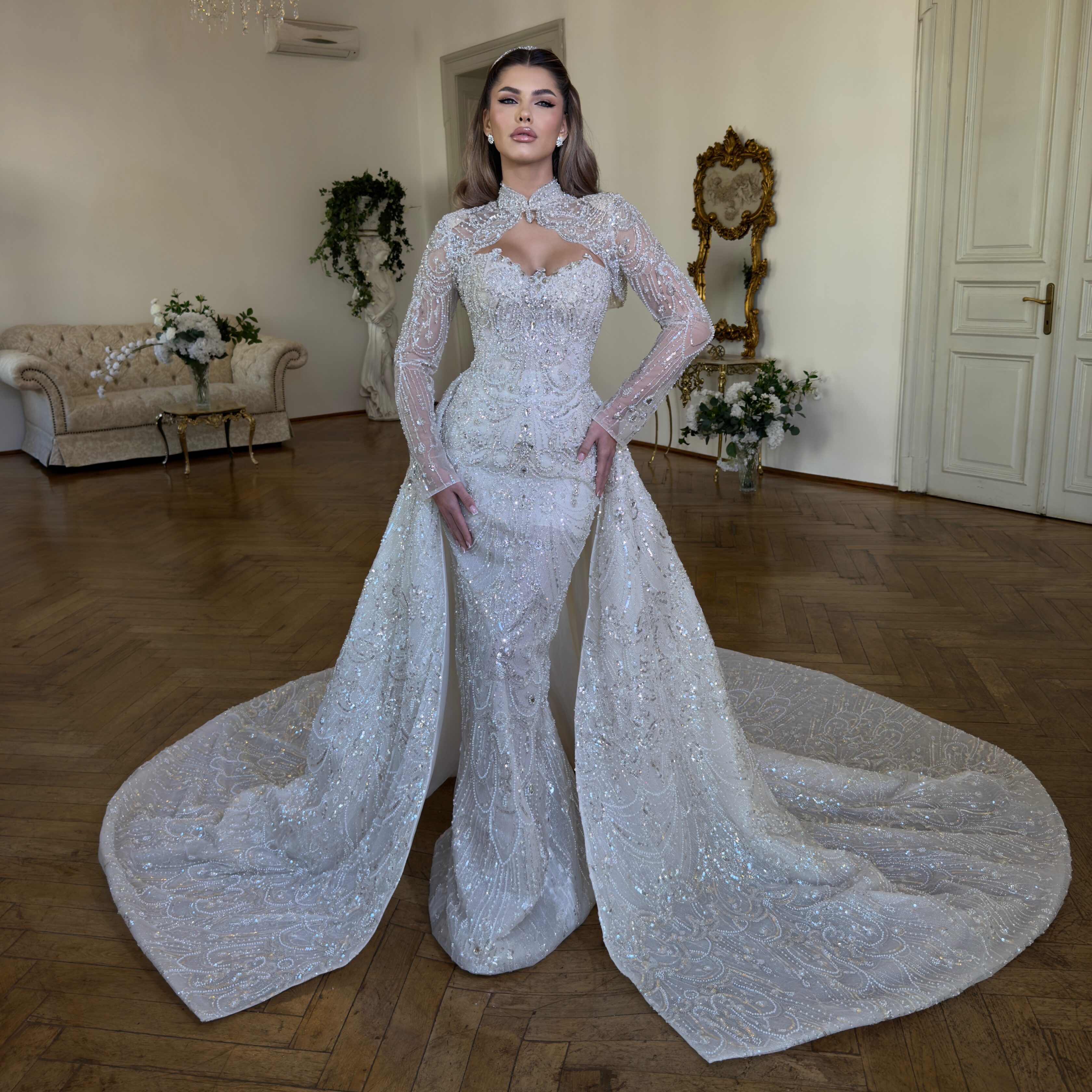 Materialele prețioase sunt puse în valoare printr-o broderie filigran, lucrată cu un fir de platină ce conferă rochiei un aer regal. Fiecare detaliu este cusut manual cu pietre, cristale și perle, creând o suprafață strălucitoare, delicată și deosebit de rafinată. Croiala sirenă subliniază silueta, în timp ce manecile și elementele detașabile permit o versatilitate elegantă, adaptată fiecărui moment.