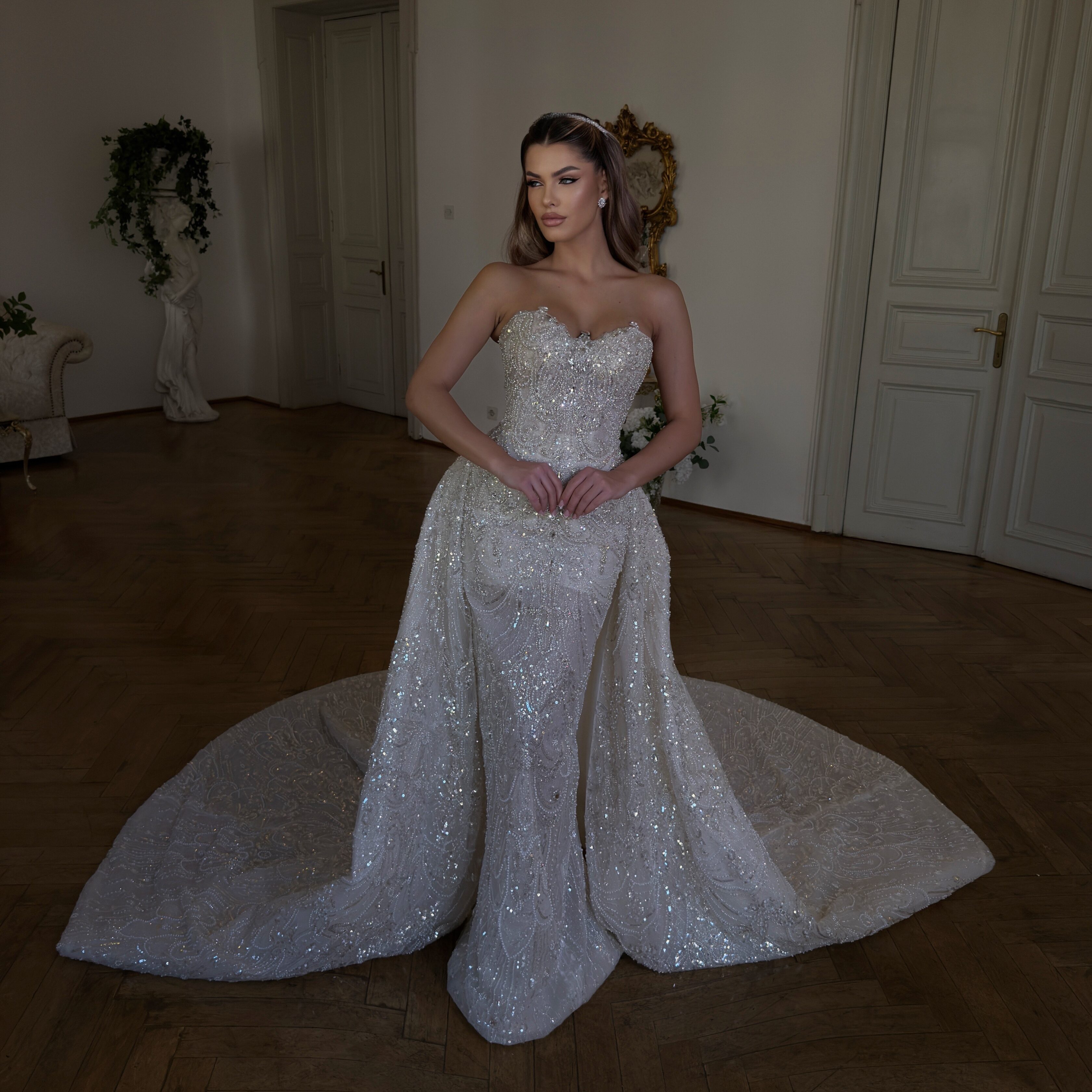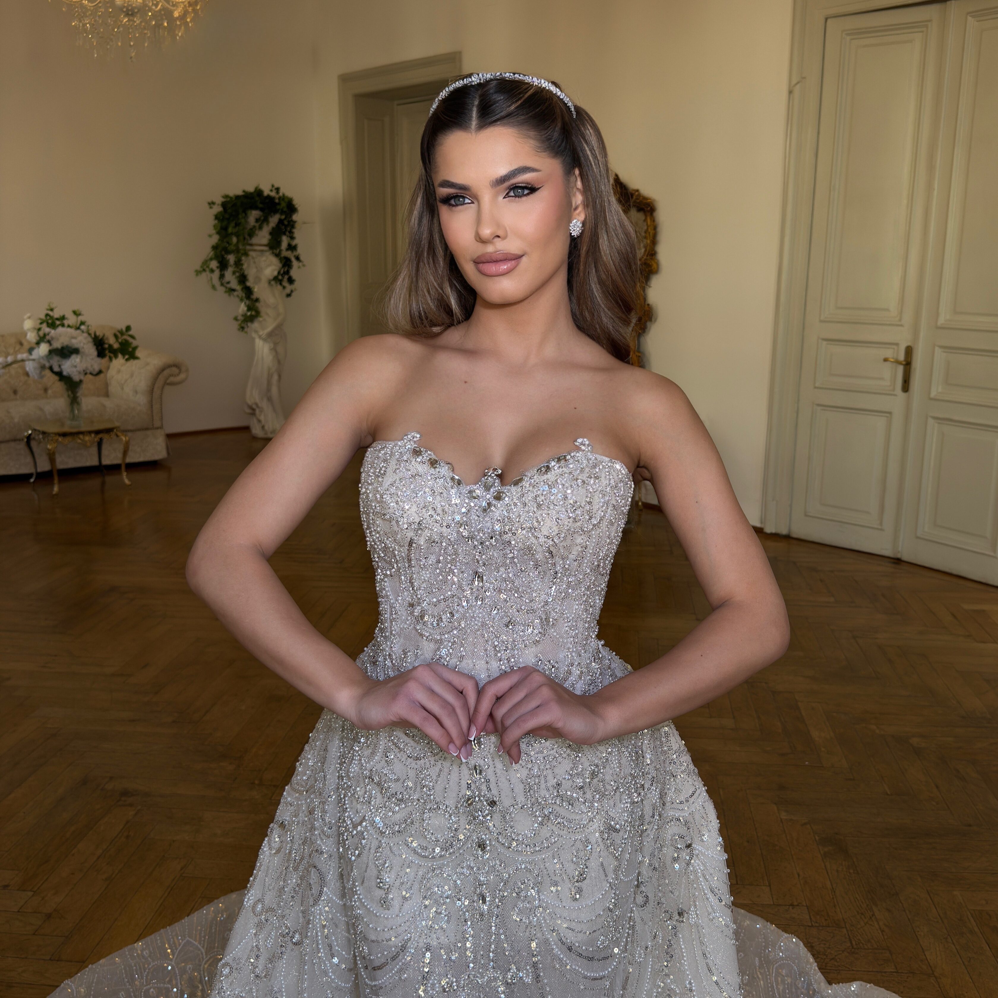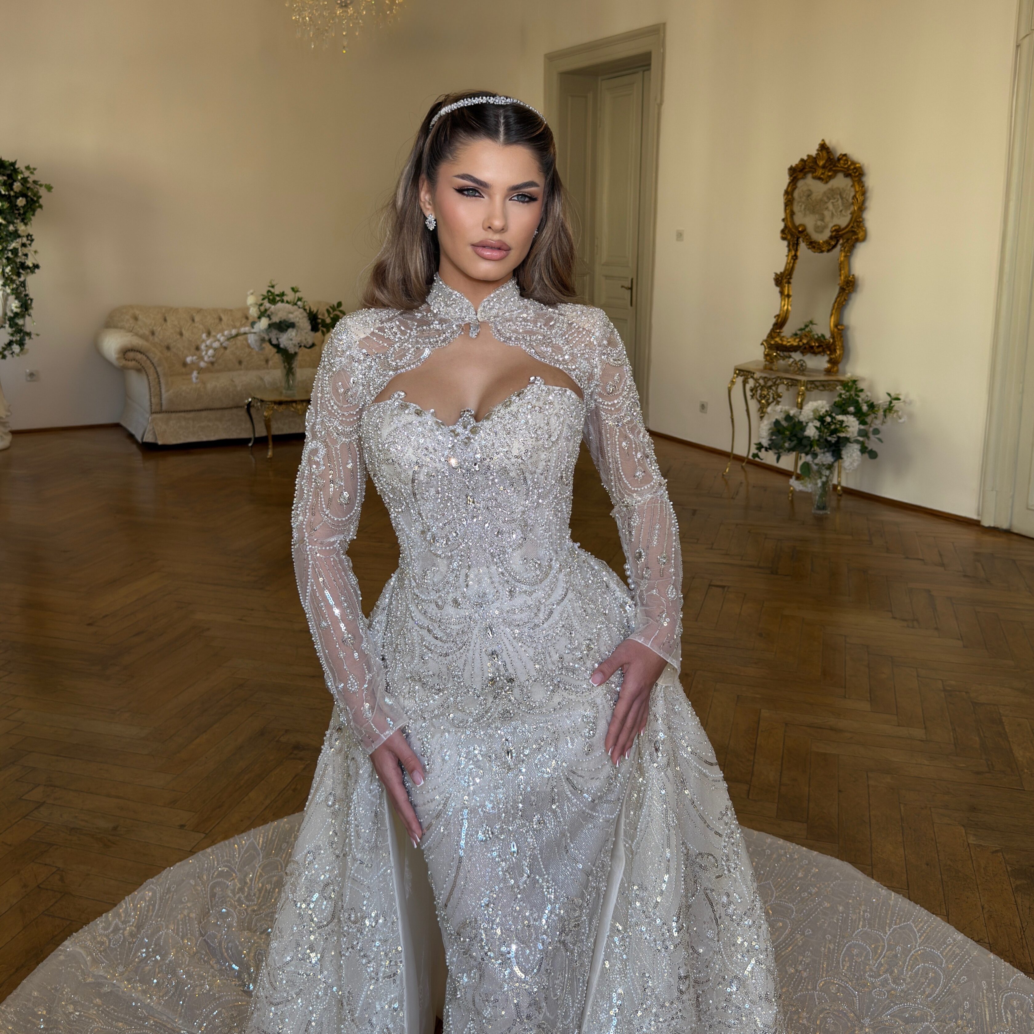 Rochia de mireasă Missy este o adevărată capodoperă couture, creată pentru mireasa care își dorește o apariție spectaculoasă, strălucitoare și extrem de sofisticată. Concepută ca o ținută 3 în 1, Missy include rochia principală, un bolero fin și o trenă detașabilă, oferind posibilitatea de a transforma look-ul pe parcursul zilei, de la ceremonie până la petrecere.