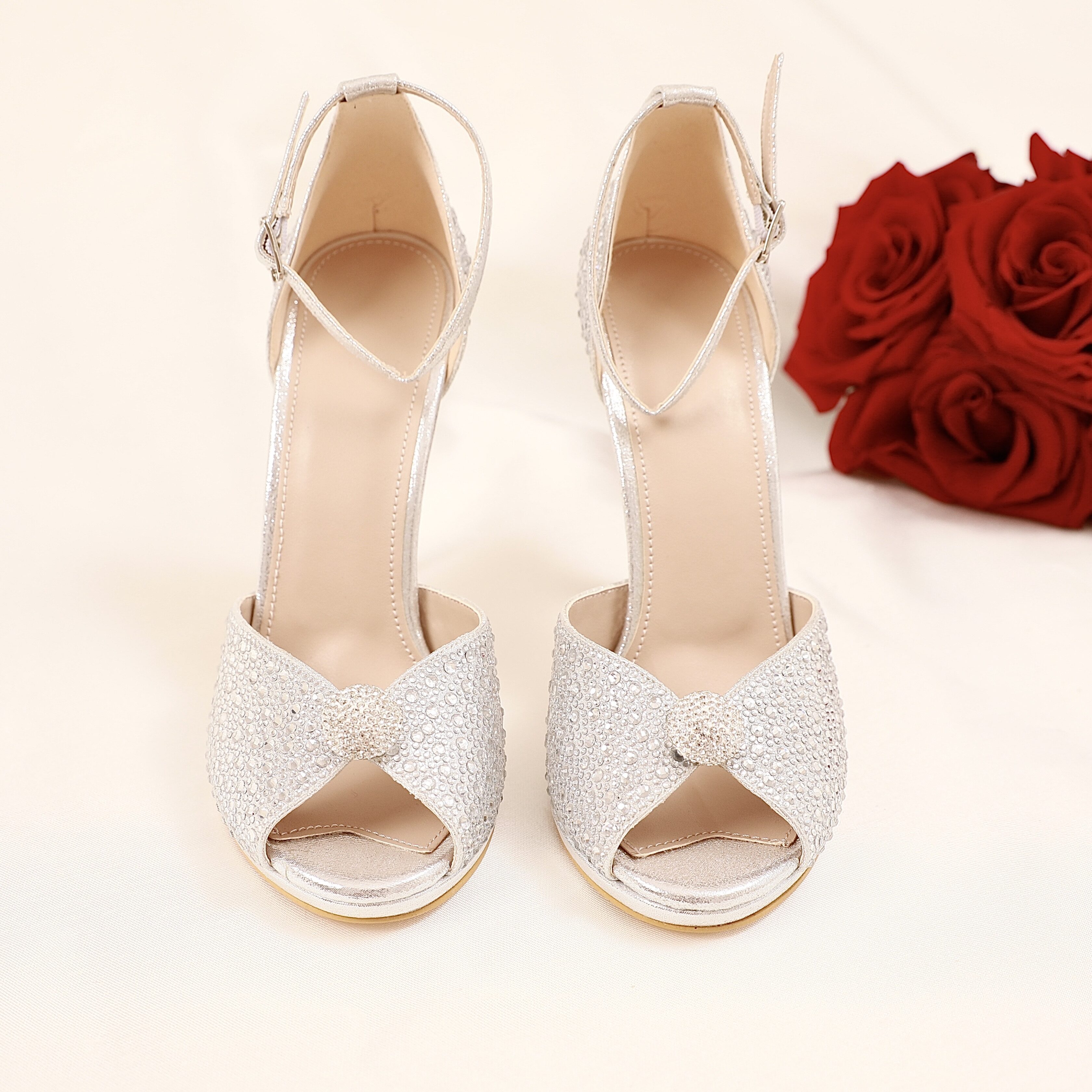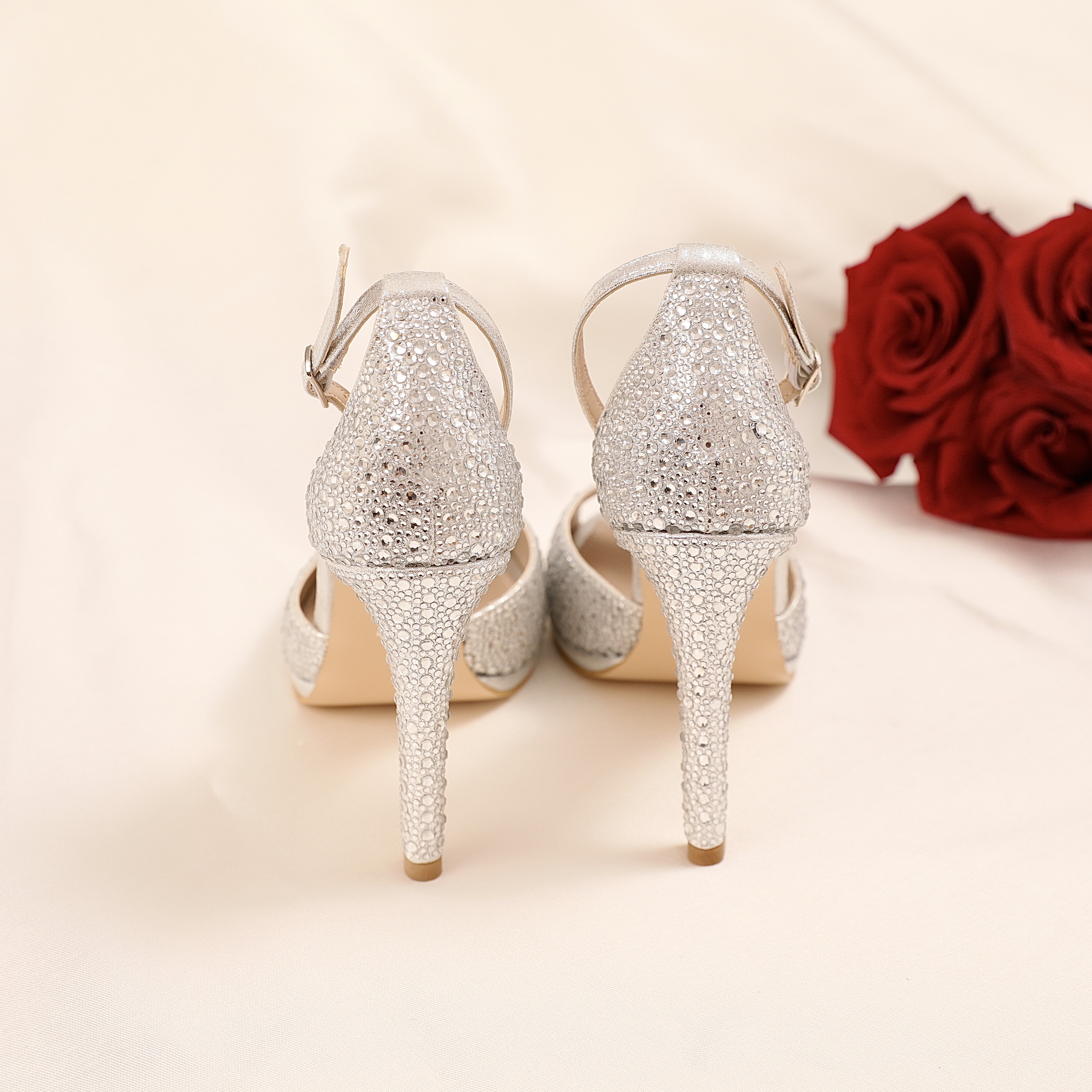 Realizate din piele vegană argintie, au un finisaj sofisticat, care reflectă discret lumina. Cristalele aplicate și accesoriul frontal cu pietre adaugă un plus de rafinament, transformându-le într-o alegere ideală pentru un look spectaculos.