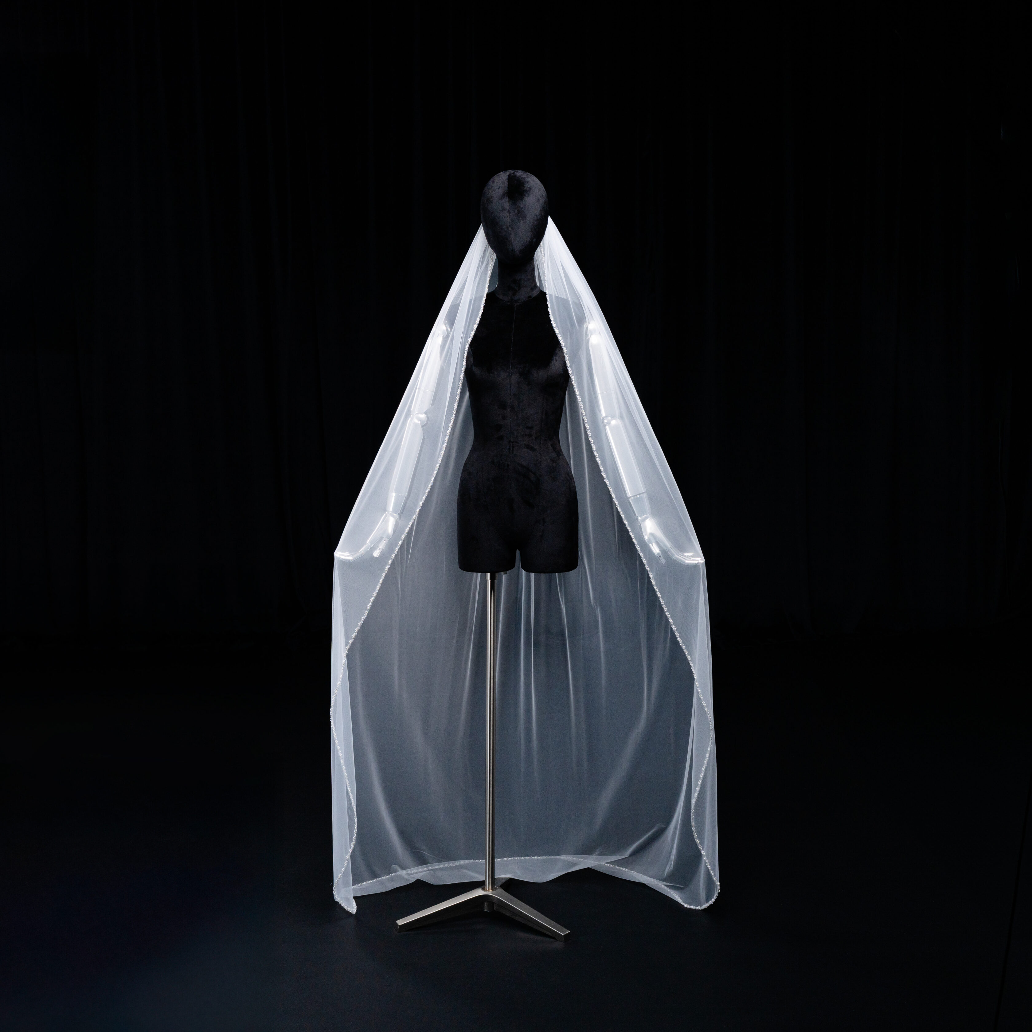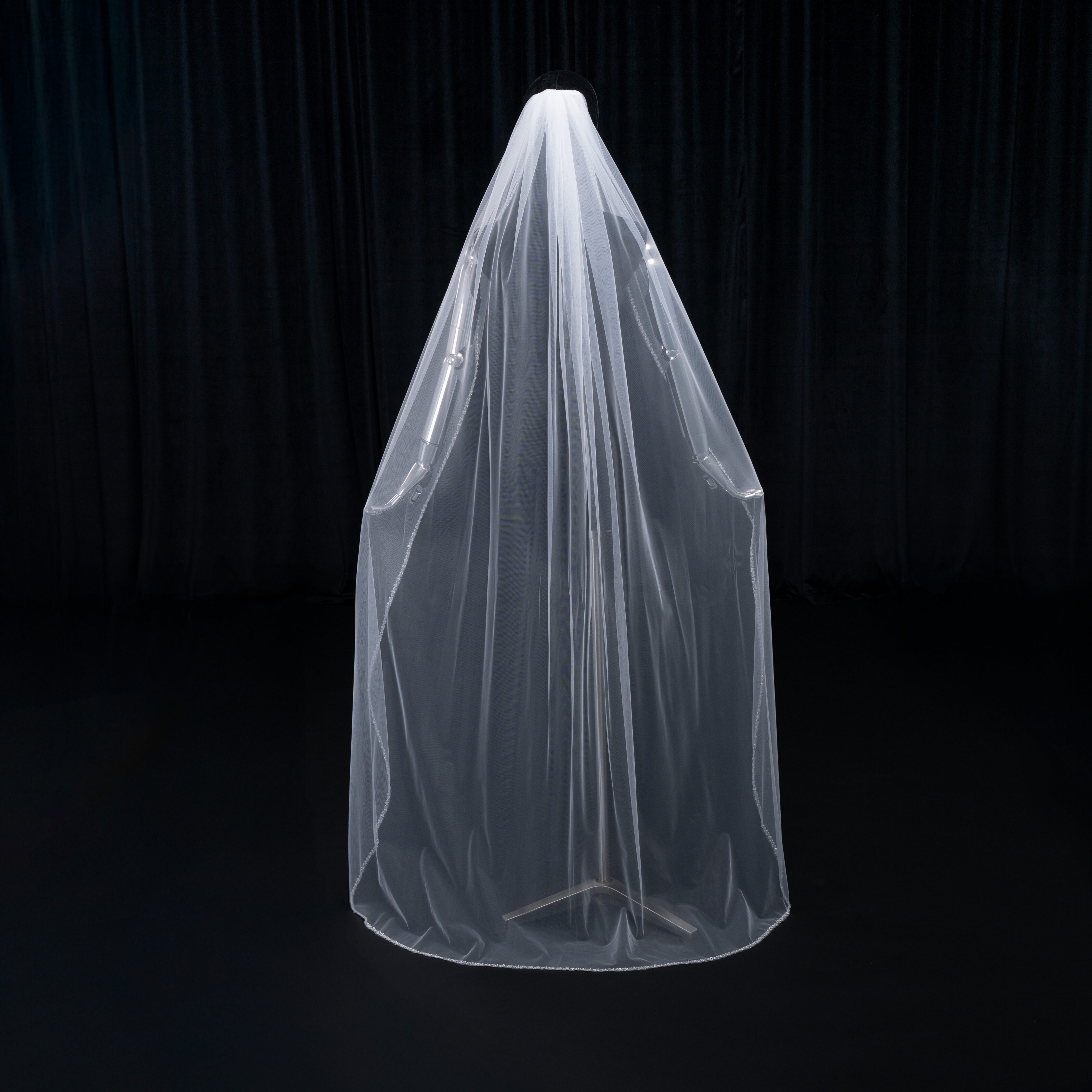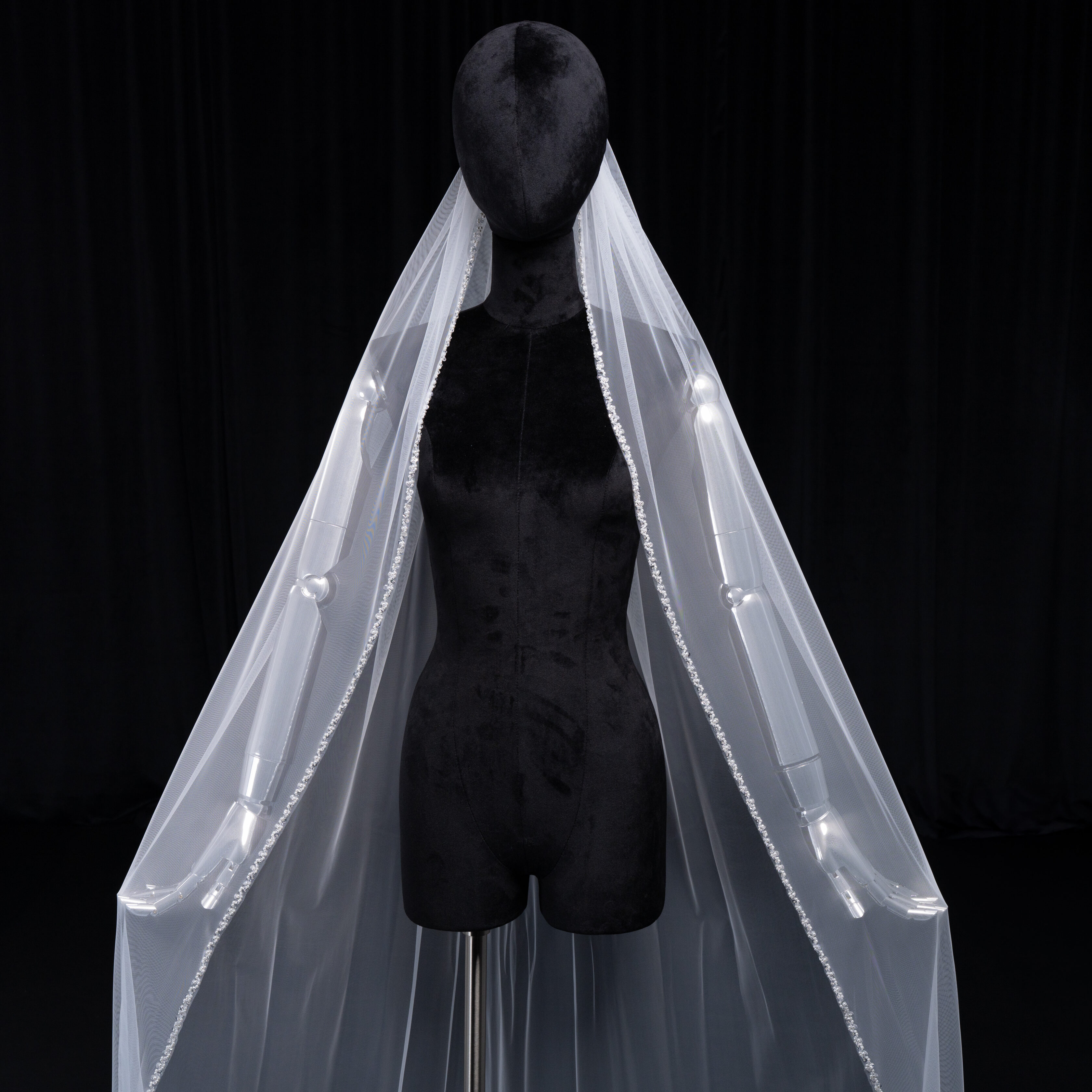 Voalul Violeta este un model lung, elegant, realizat dintr-un singur strat de tulle fin. Marginea este cusută manual cu cristale și mărgeluțe strălucitoare, pentru un efect discret, dar vizibil. Un accesoriu rafinat, perfect pentru o ținută memorabilă.